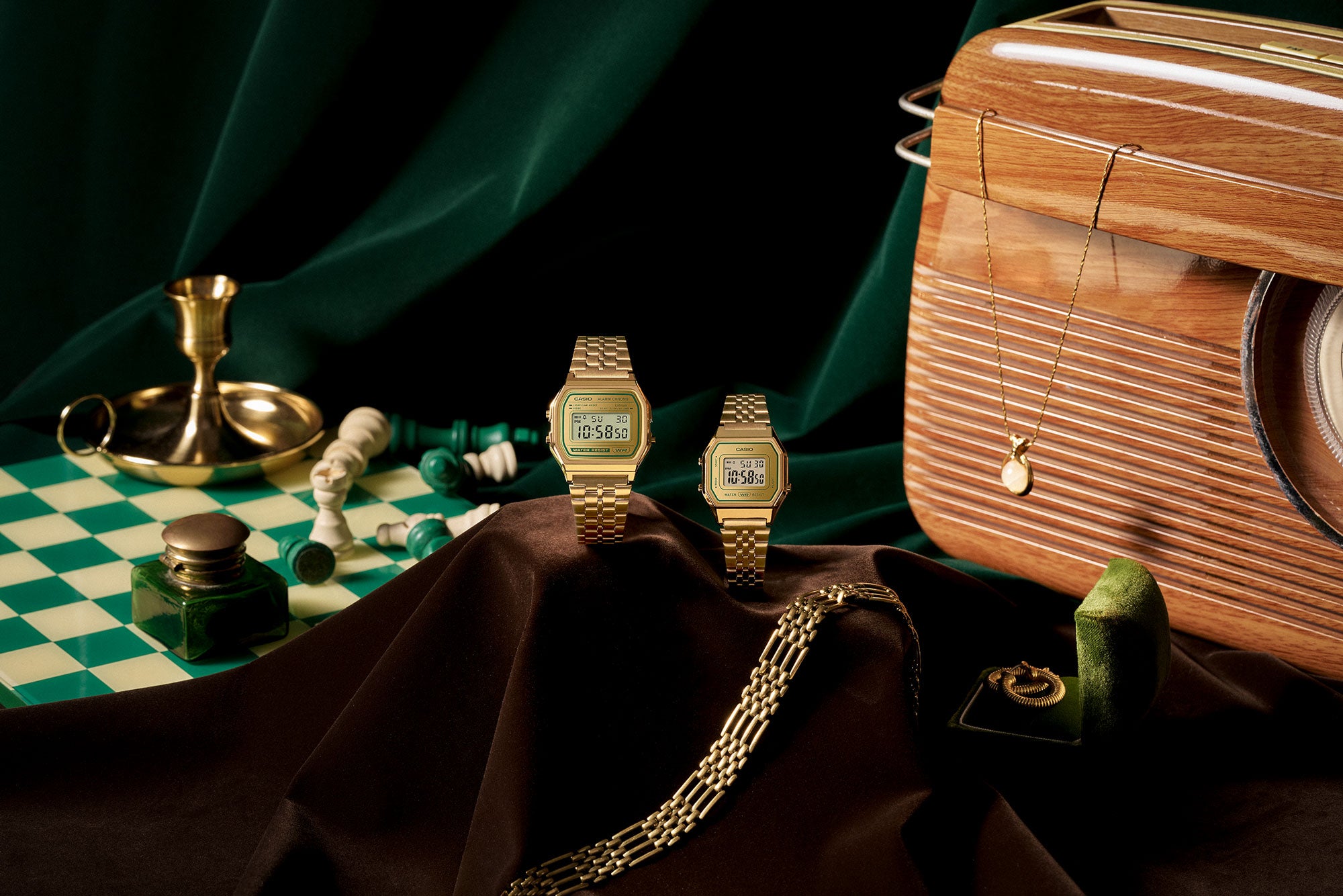 CASIO unveils a duo of timepieces that blend timeless charm with bold sophistication. These models, crafted with stylish green detailing against a classic gold base, add a modern edge to your wrist while staying true to the iconic CASIO aesthetic.