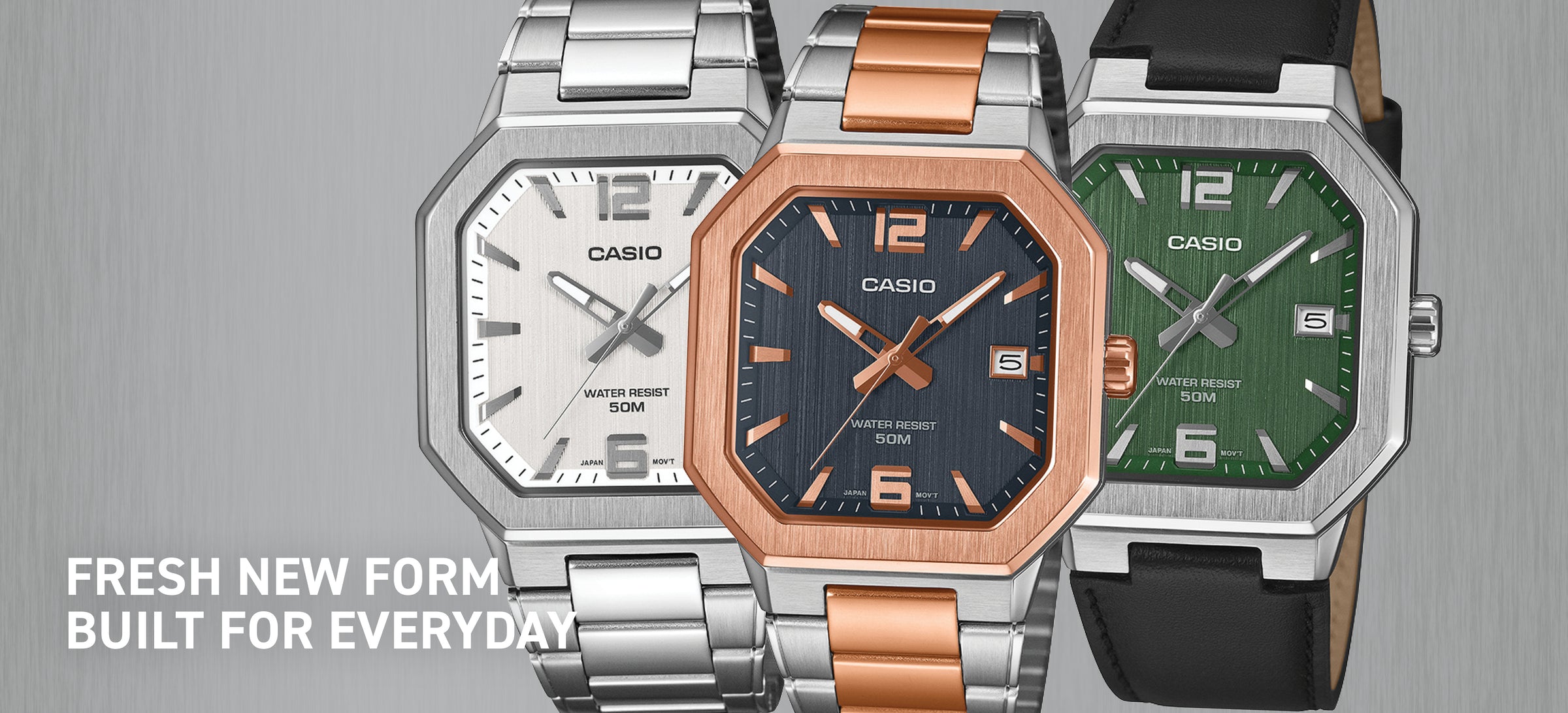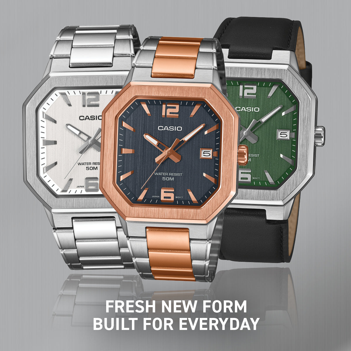 CASIO closes out the year with something genuinely fresh. This new silhouette introduces a bold square case, offered in two distinct finishes that shape the collection into a modern essential. The metal series features a refined stainless steel build with a crisp dial and polished detailing, while the leather band series brings a softer, classic feel with smooth textures that add warmth and versatility. Together, they form a new direction for CASIO, united by a shape that has never appeared in the lineup before and crafted to elevate everyday styling while staying true to the brand’s heritage of practical, reliable timekeeping.