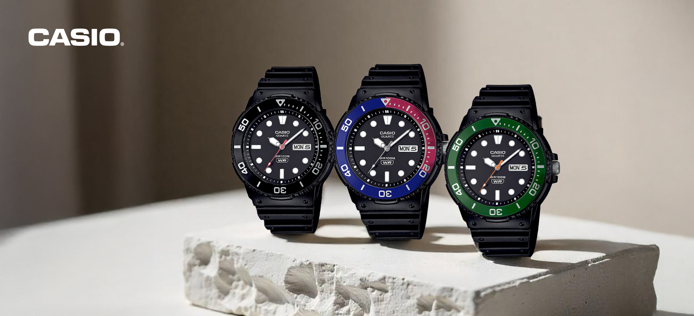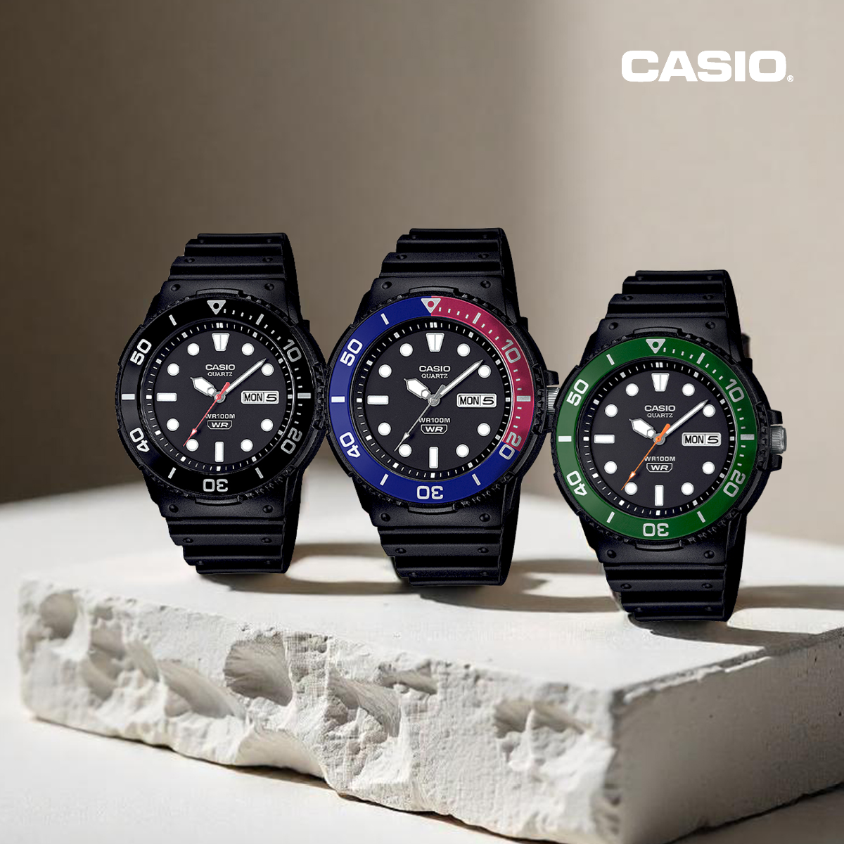 Available in three colour variations—green, blue/red, or classic black—each model features a black dial with crisp white accents for easy styling. The MRW230H nails that versatile, everyday vibe. A true go-to for anyone chasing that clean, sport-luxe energy.