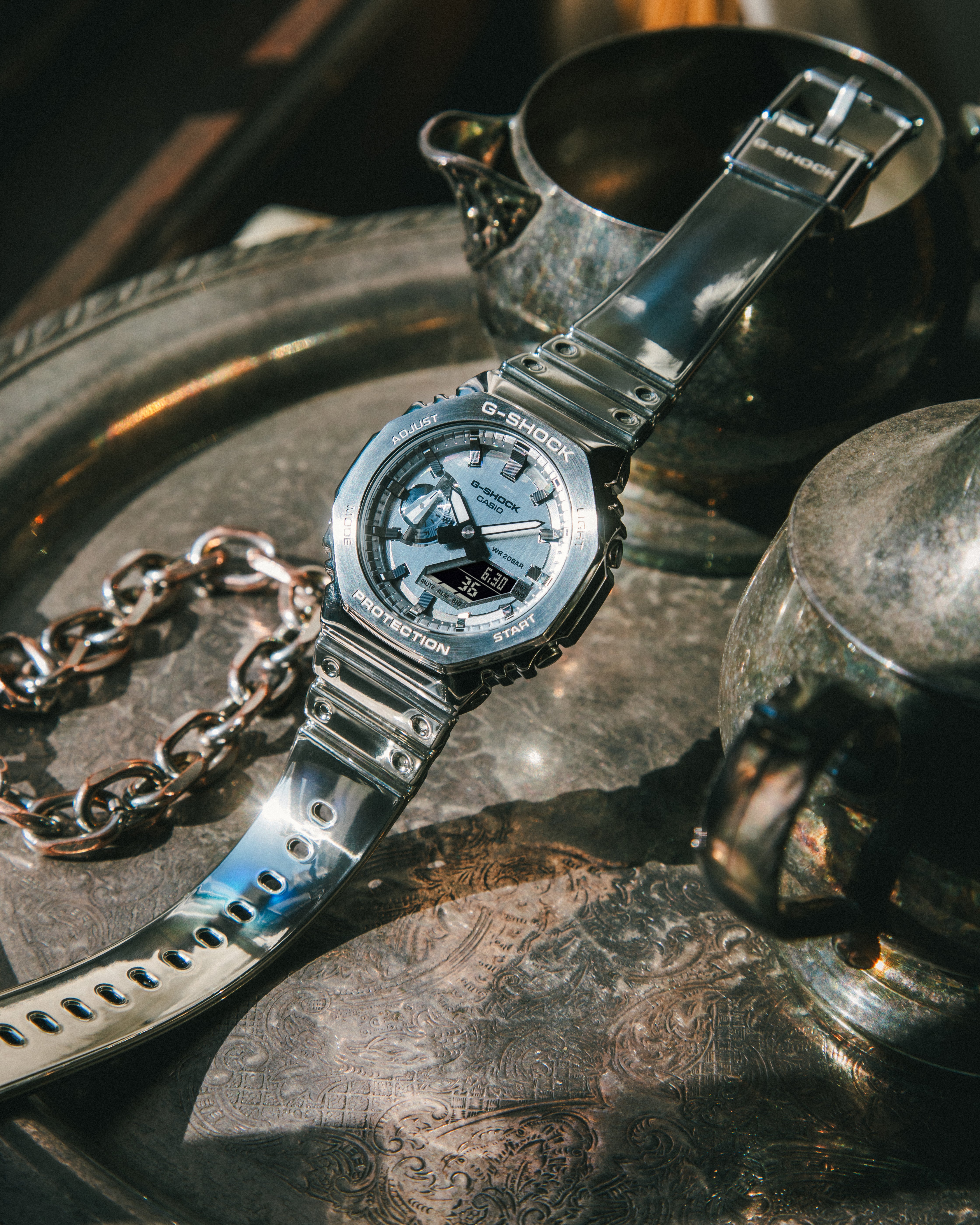 This show-stopping lineup reinvents two of G-SHOCK’s heavyweights – the classic GM5600 and the sleek, octagonal GM2100 – with bold metallic upgrades. Each watch boasts a stainless steel bezel that has been crafted with precision through unmatched forging, cutting and polishing techniques. The result: a striking metallic face that shimmers with a mix of textures for gut-punching impact. And the luxe doesn’t let up on the band either. The newly developed tough silicone band pairs flexibility with G-SHOCK’s signature durability for a fit that’s as comfortable as it is rugged. For a final touch of distinction, the underside of the band is treated with vapour-deposited gold or silver finishes, creating a seamless metallic aesthetic from every single angle.