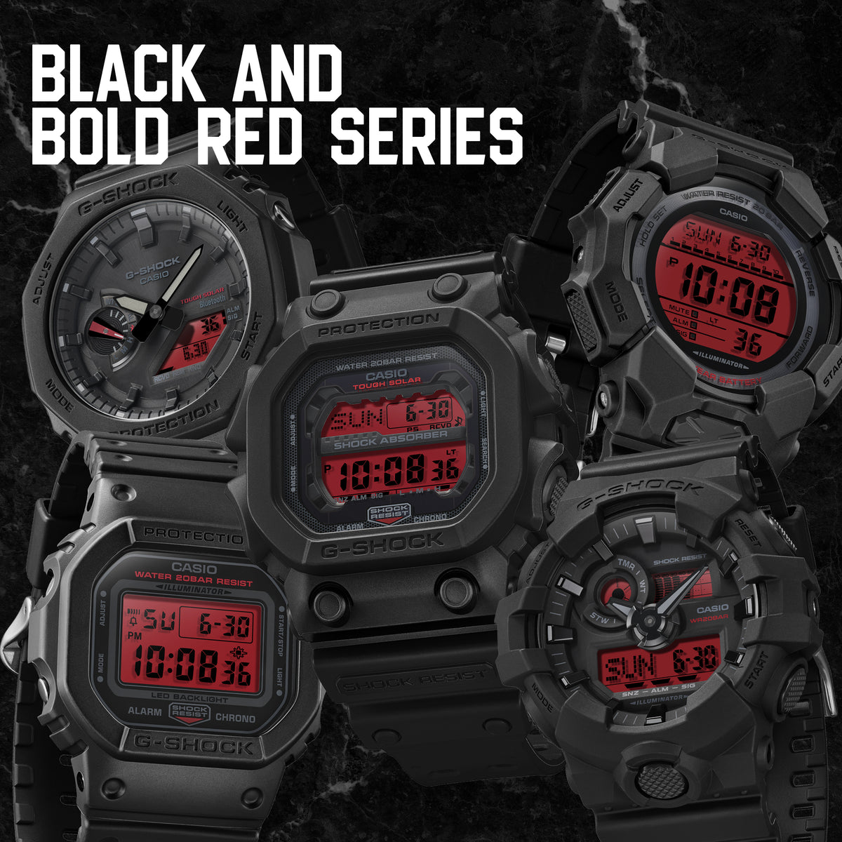At the heart of the collection is a diverse lineup of silhouettes, each reimagined in blackout casing with bold crimson displays. The DW5600BBR-1D keeps things classic with its squared-off legacy shape, while the GAB2100BBR-1AD sharpens the angles with an octagonal case and analogue-digital layout. On the bigger end of the spectrum, the GA700BBR-1AD delivers a punchy wrist presence with oversized dimensions and a hybrid display. For those chasing future-forward functionality, the GD010BBR-1D offers a more aggressive design language and elevated durability. And if it’s rugged, shock-resistant bulk you’re after, the GX56BBR-1D goes full tank mode – a true digital juggernaut with a rectangular face that dominates the wrist.
