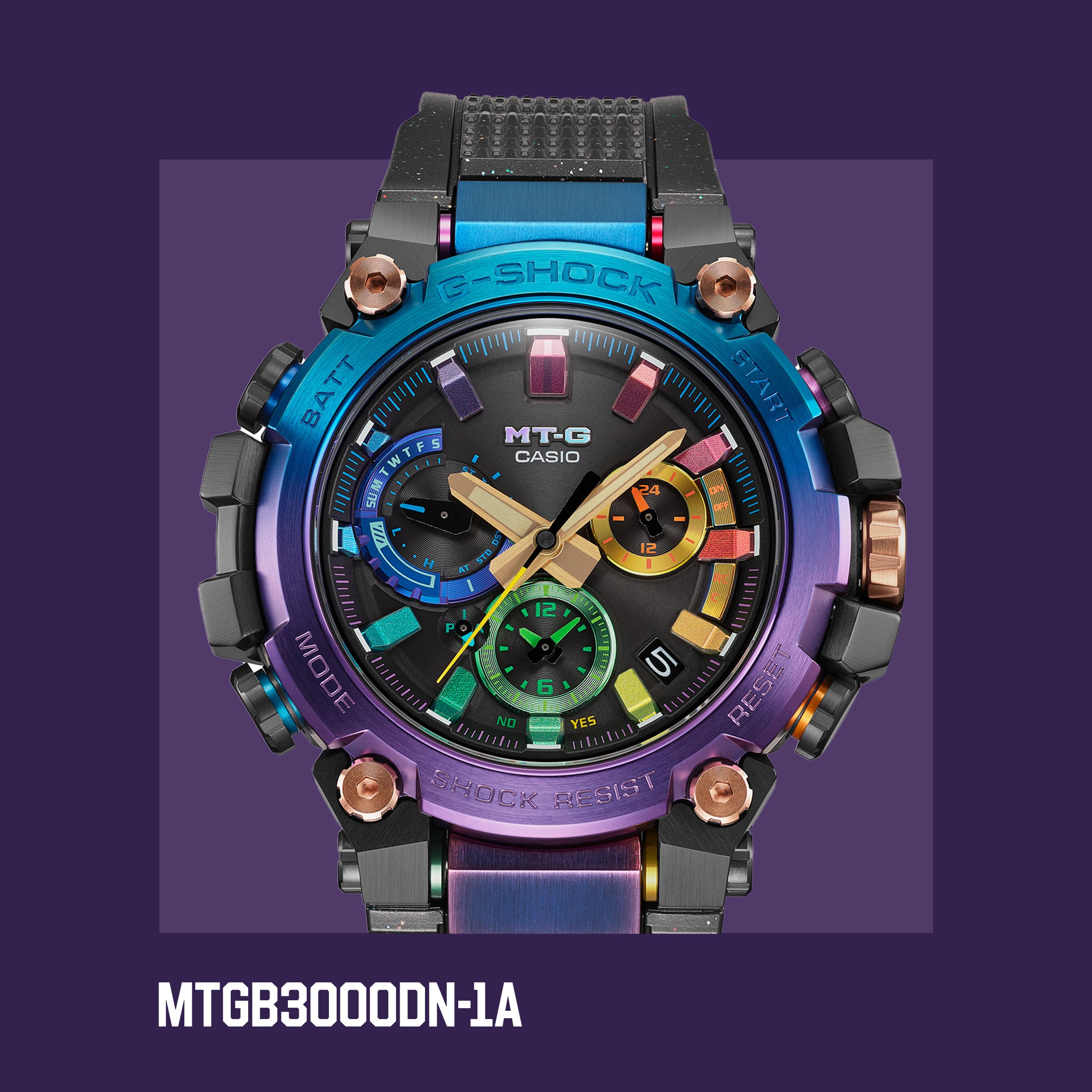The newest recruit to G-SHOCK’s infallible Metal Twisted project, the MTGB3000DN-1A appropriately adopts the striking luminescence of stardust, with ethereal gradated blue and purple on the ion plating and iridescent details on the indices and subdial rings. The band is also made with soft black urethane that is mixed with four colours of aluminium material, again launching the space-age theme into hyperdrive.
