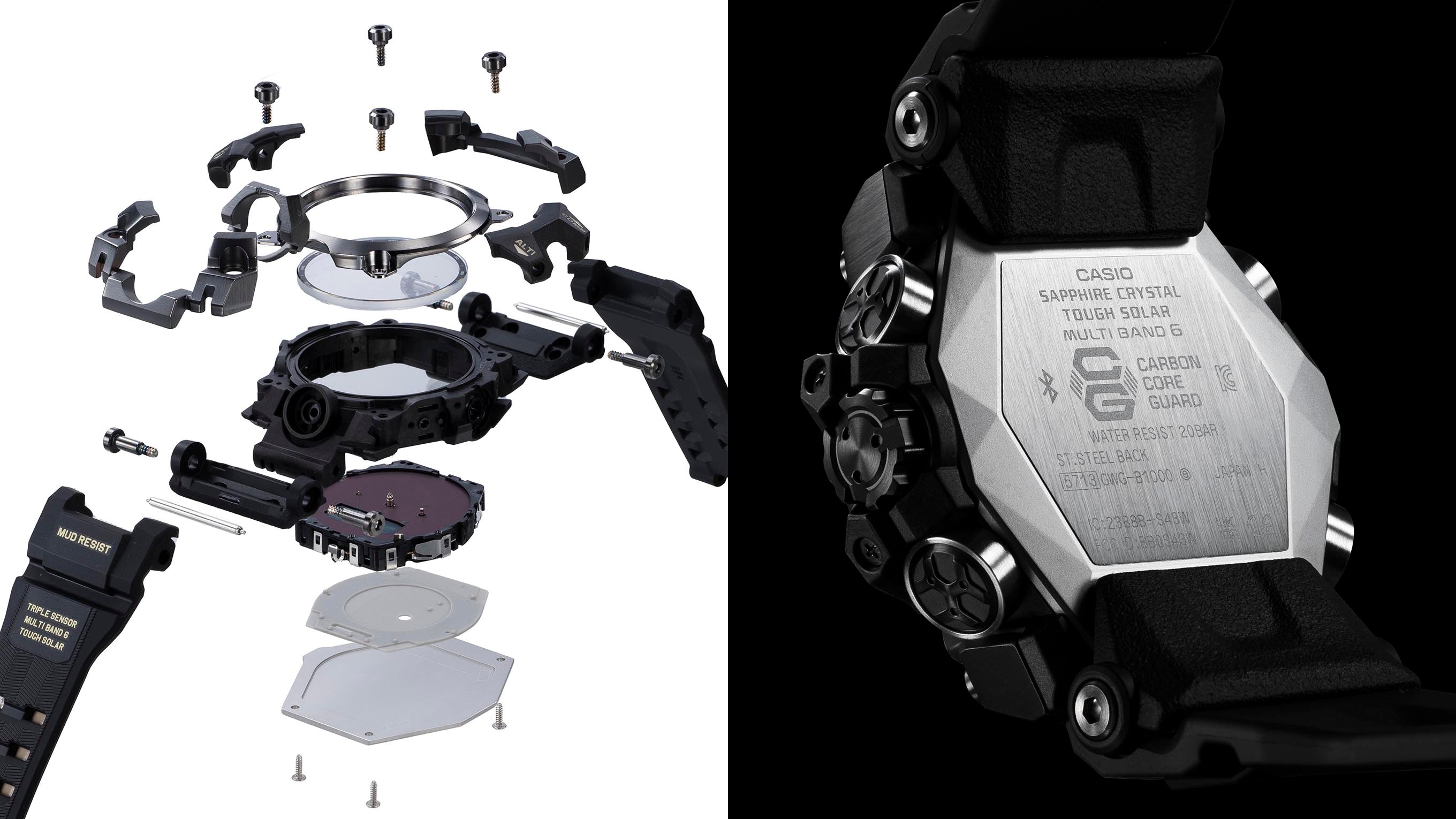 The buttons are protected by cylindrical stainless-steel parts, and the button shafts are equipped with gasket fittings to prevent contamination with mud and dust. The GWGB1000EC features a crown with a screw-lock construction to ensure a water-tight seal.