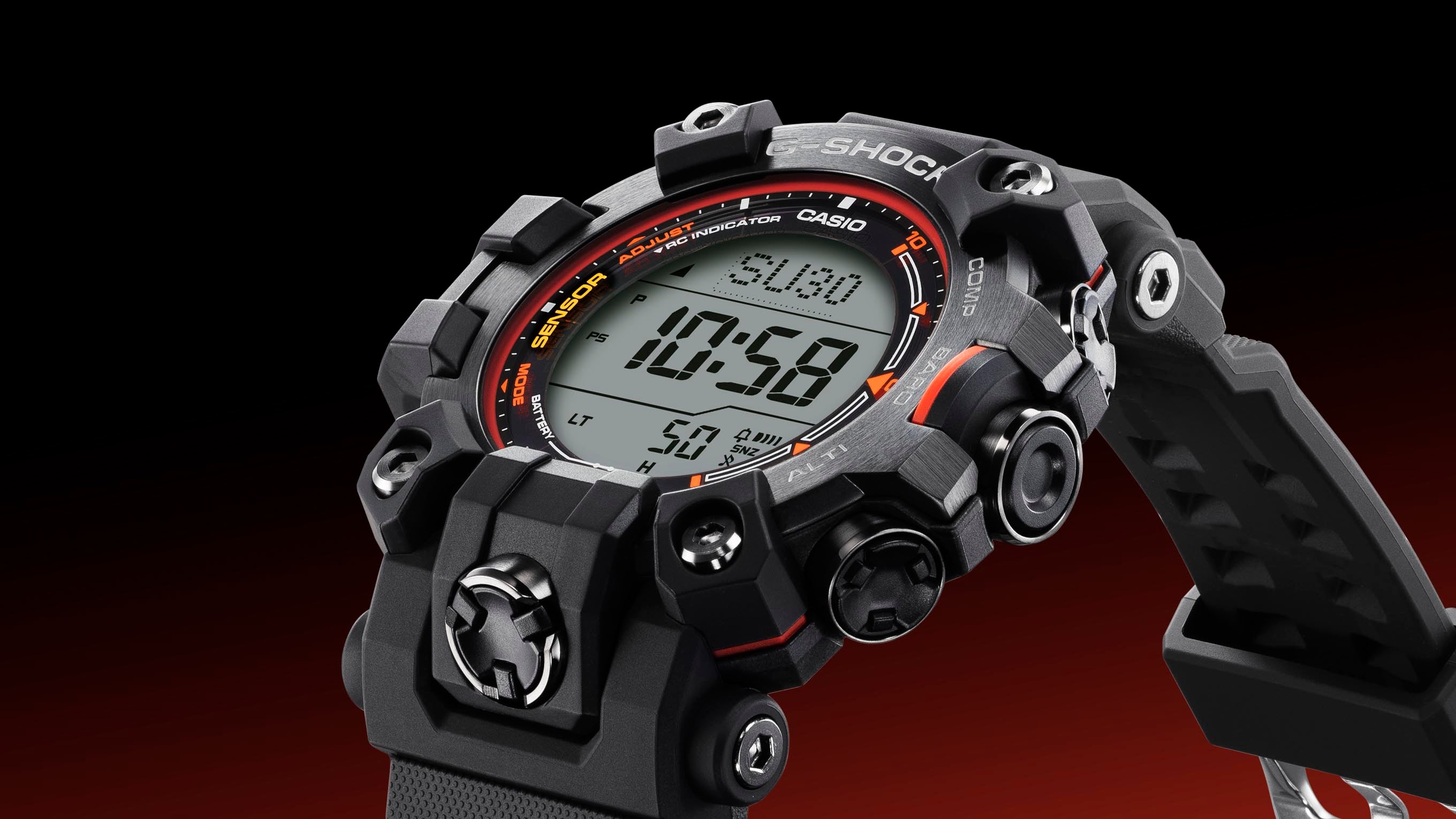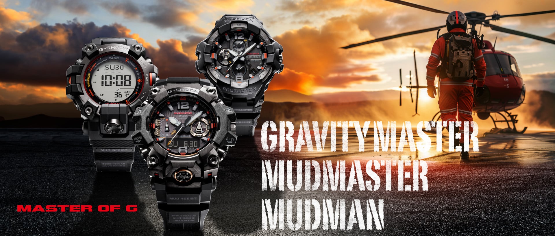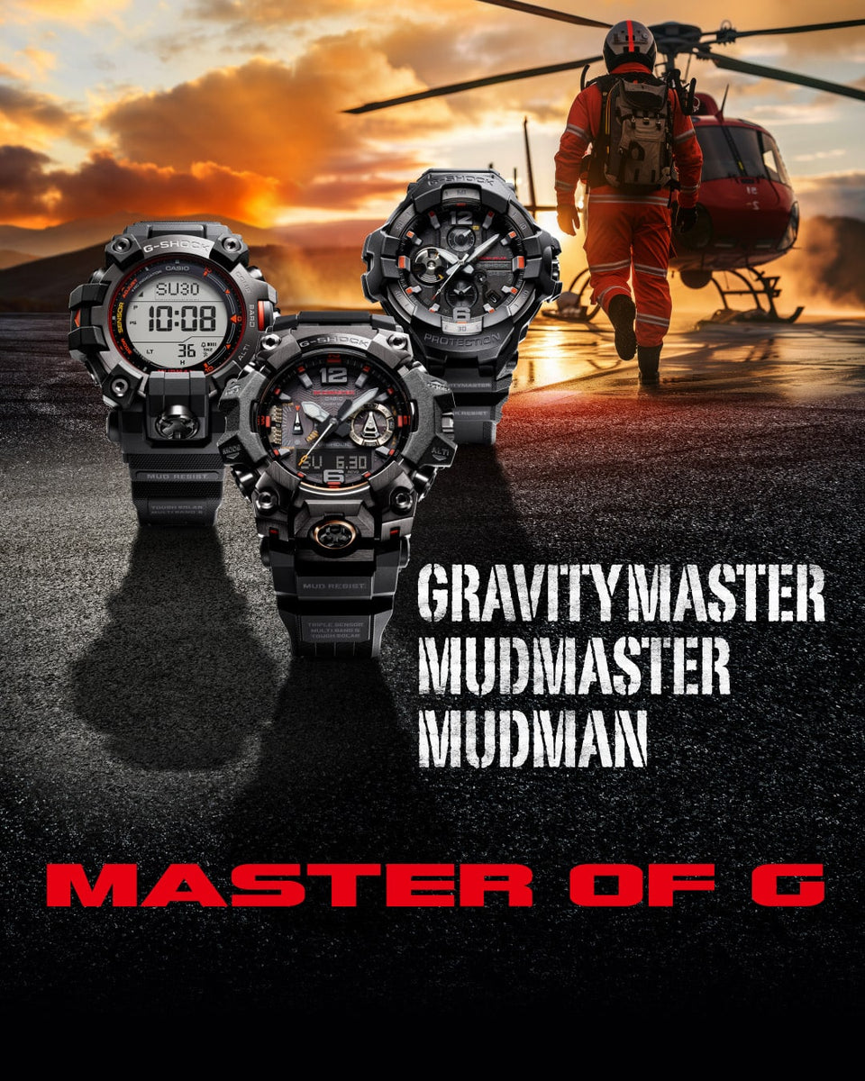 The G-SHOCK Master of G series introduces bold emergency colour accents to enhance visibility and style. Built with a rugged black case, these watches are designed to perform in extreme conditions, both on land and in the air. Inspired by rescue missions, the GRAVITYMASTER, MUDMASTER, and MUDMAN models deliver unmatched reliability and functionality.