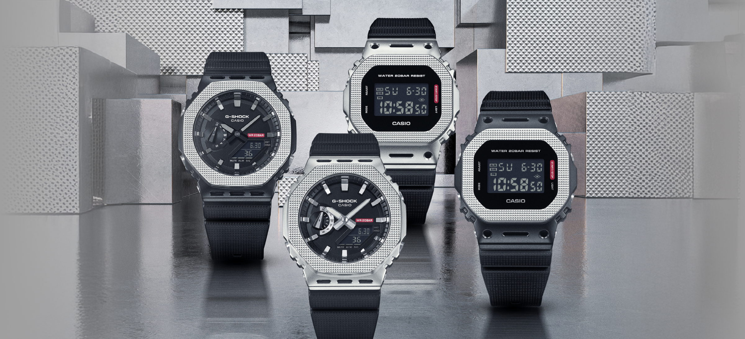 The Modern Industrial series presents a refined look at metal layered toughness through two silhouettes that define the G SHOCK legacy. The iconic 5600 delivers the original, unmistakable G SHOCK attitude, while the 2100 series introduces a modern architectural expression that has quickly become a favourite. Together they show the versatility of the brand’s design language while staying united in purpose.