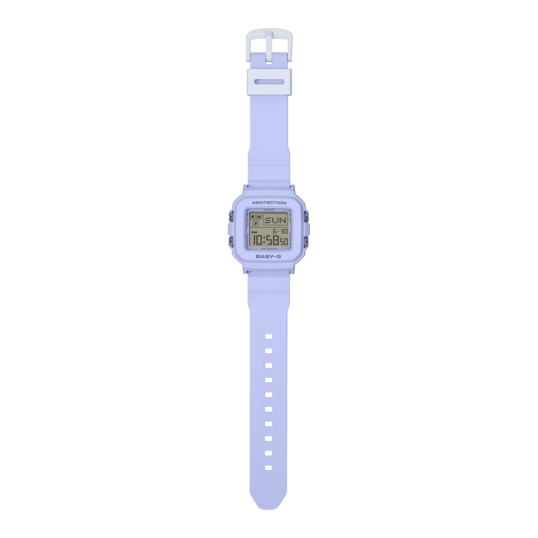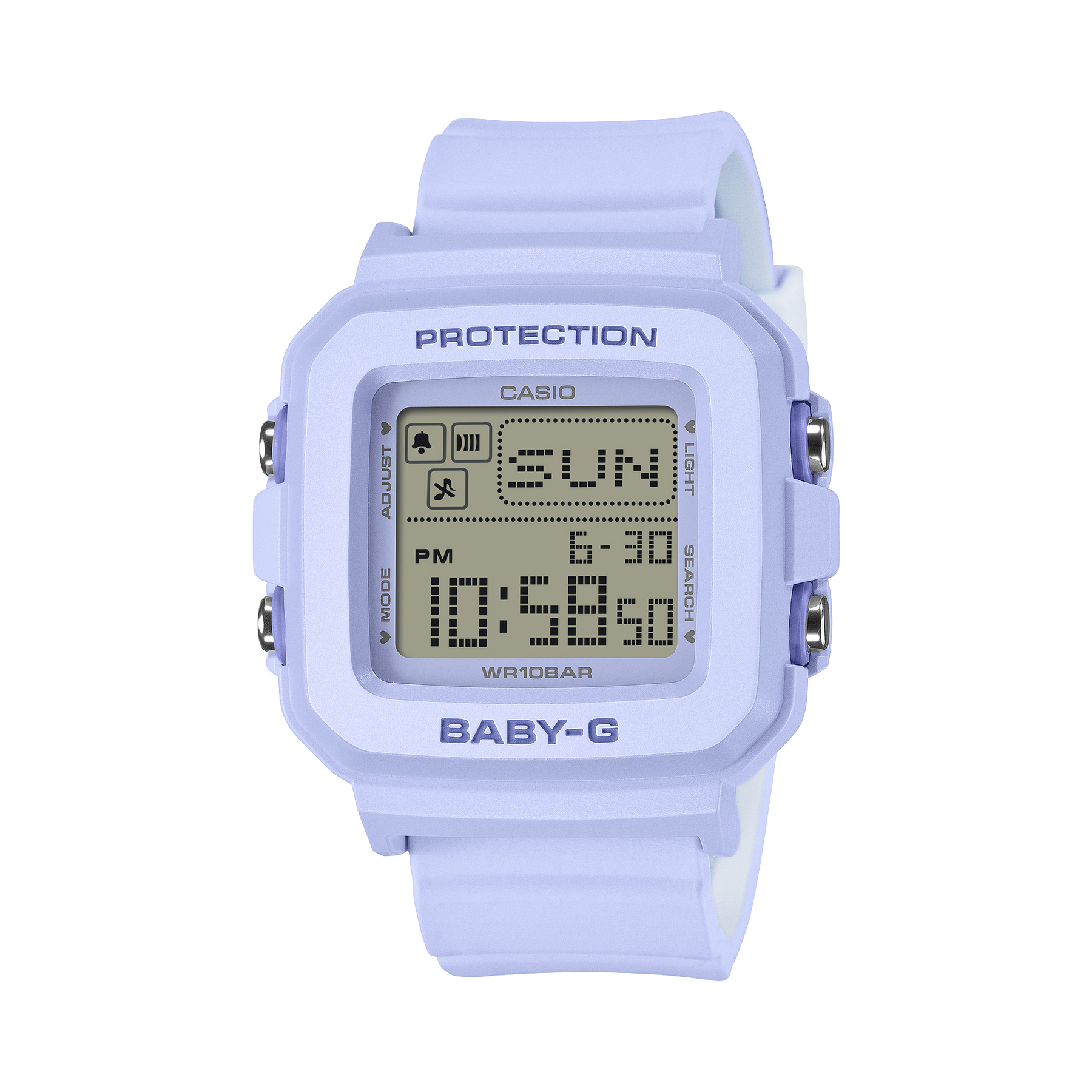 A heart appears on the LCD when the LED backlight is illuminated. In Time Mode, pressing the light button displays a random pixel-art animation. The clear digital display keeps the time easy to read while offering a touch of BABY-G fun.