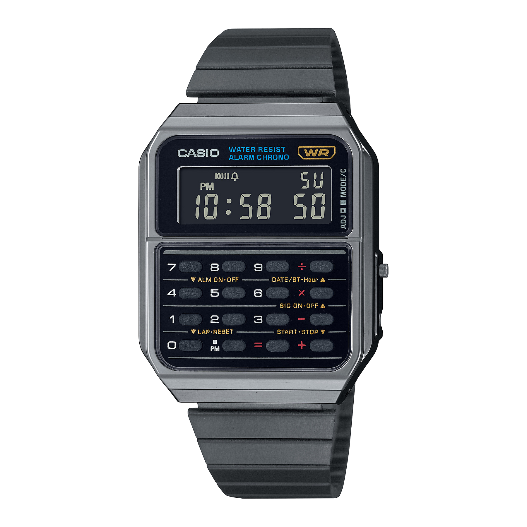 Indulge your love for gadgety design with a Casio watch with calculator functions in metallic colour.