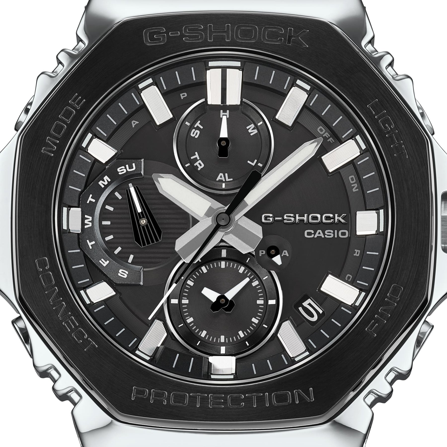 Striking black on silver projects G-SHOCK toughness: Monochrome design suited to a wide range of styles