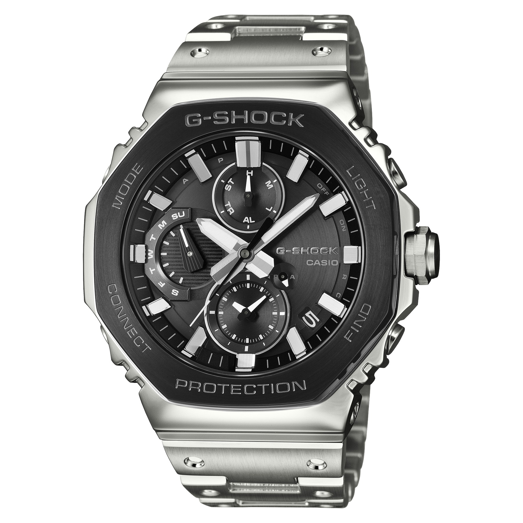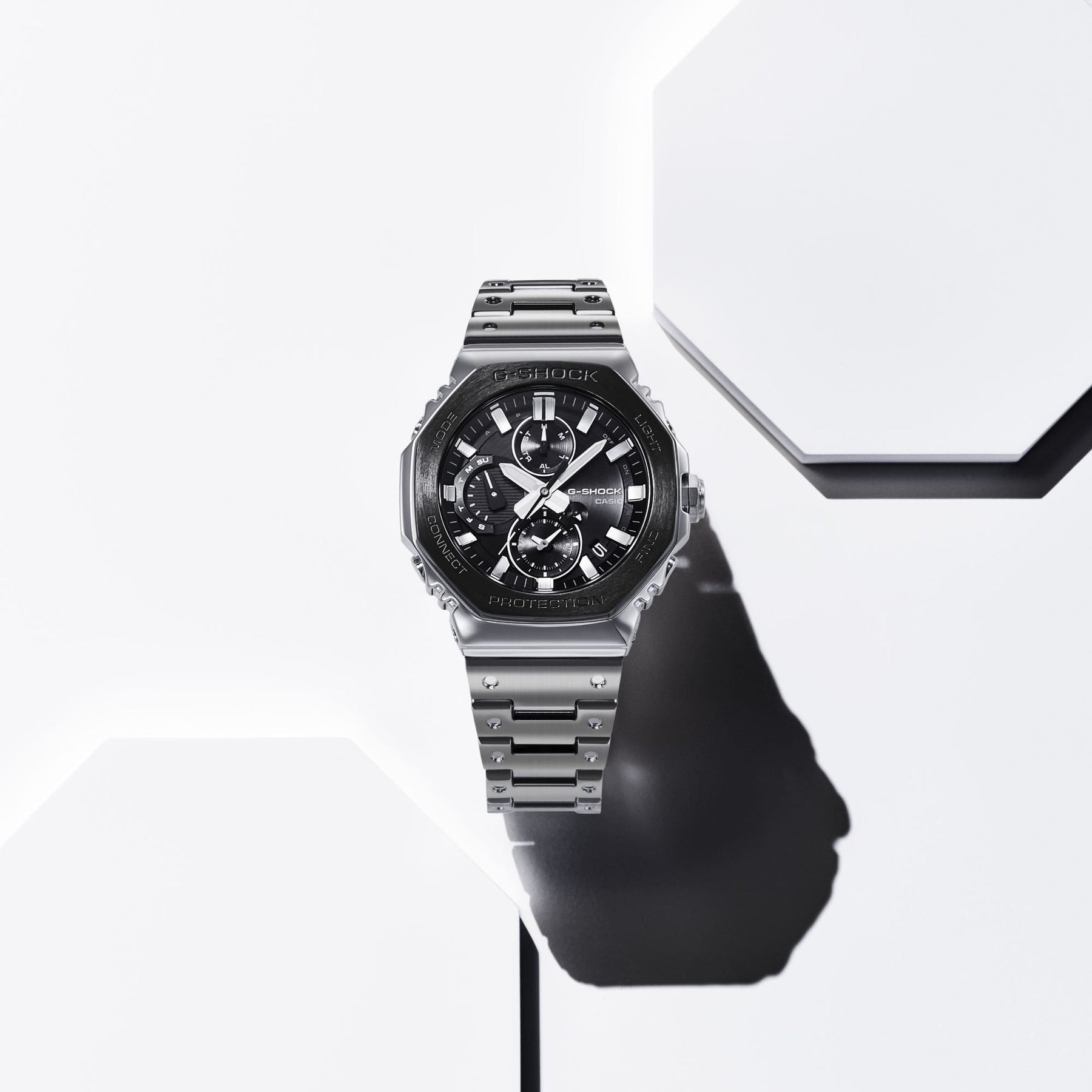Crafted from stainless steel, the bezel undergoes meticulous processes of forging, cutting, and polishing to achieve an exquisite finish of depth and dimension. To achieve the same original G-SHOCK shock-resistant structure in a full-metal timepiece, buffering components made of fine resin are inserted between the stainless-steel bezel and case. And dimpling is applied to metal band pieces to reproduce the look of the very first G-SHOCK resin band design.