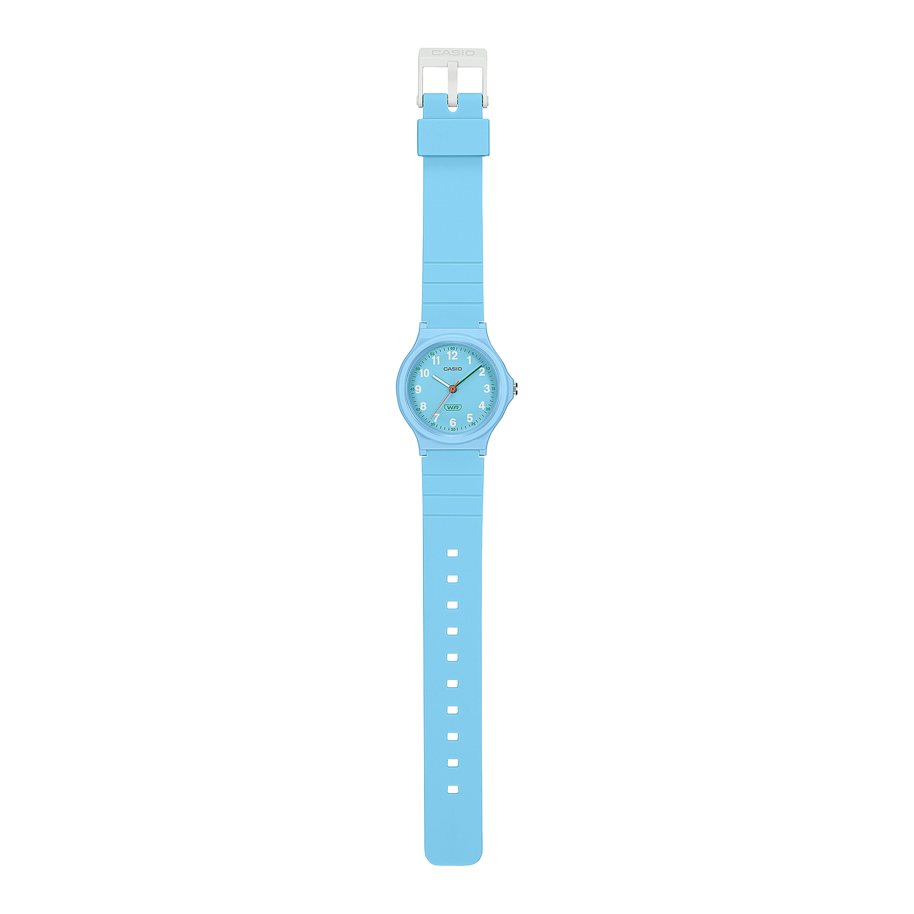 The hour and minute hands are coloured to match the corresponding index marks, so it’s easy to tell time — making this an ideal first watch.