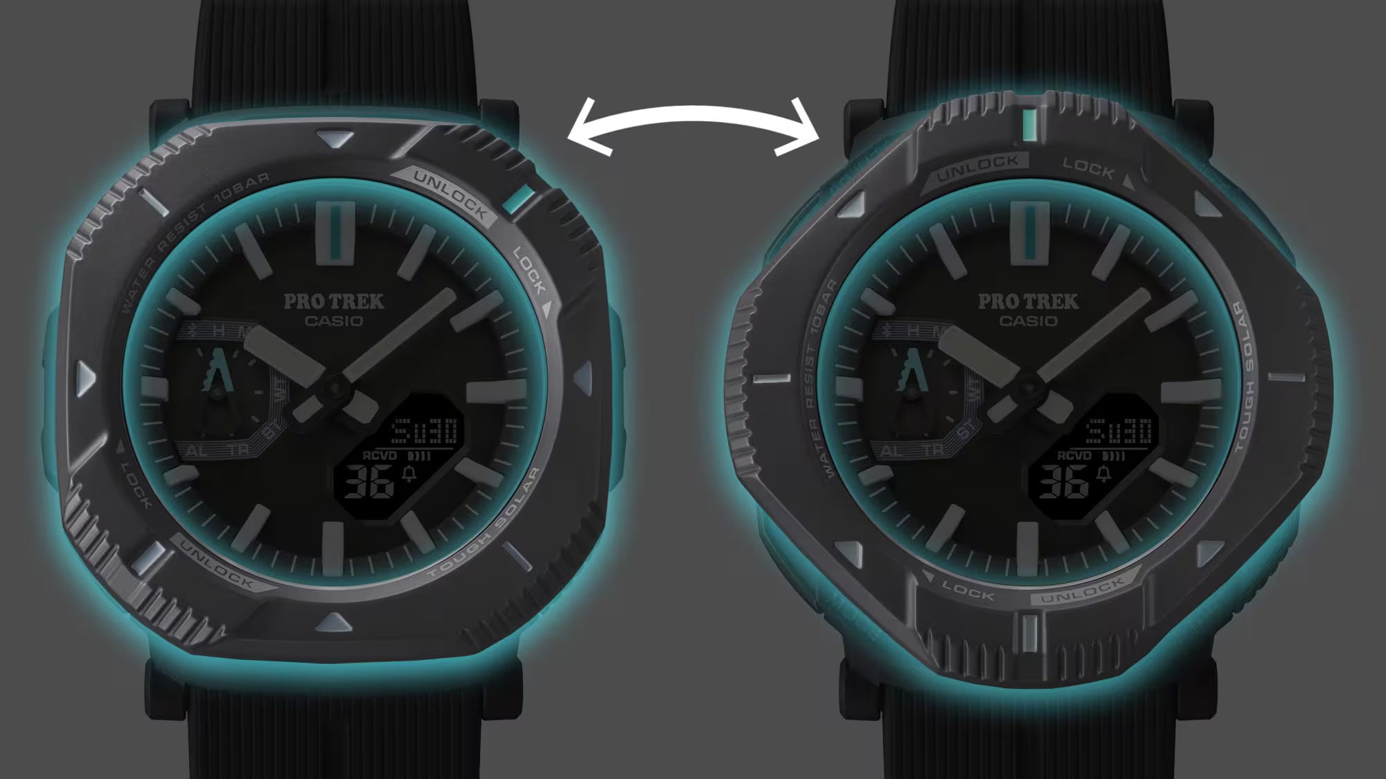 The PRJ-B001 takes it up a notch with the first rotary guard bezel in the PRO TREK line. Turn the rotating bezel to switch between two distinct styles. When set to present a stylish angular design that complements everyday fashion, the bezel covers the buttons, preventing accidental pressing of buttons while out walking or in town. Turn the bezel 45 degrees to the rounder look and uncover the buttons for easy access to functionality while out hiking or training.