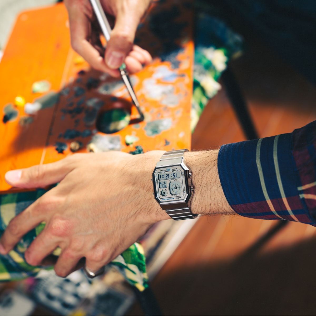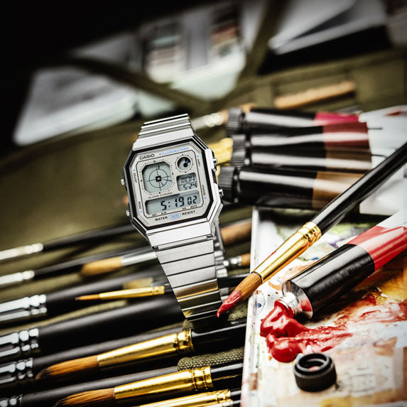Victor Takeru, a Paris-born artist of Japanese and French descent, brings his vibrant bicultural perspective to life through bold compositions and emotionally rich scenes. Now based in Tokyo, his work pulses with color and memory, evoking both the curiosity of youth and the complexity of cultural duality. This same spirit lives in the A130WE-7A, a digital watch with an analog display that captures a nostalgic love for classic gadgets, coming equipped with useful features such as water resistance, LED backlight, stopwatch, alarm and more. With its sleek metallic tones and expressive accents, it reflects Victor’s eclectic style—practical, emotionally resonant, and unmistakably original.