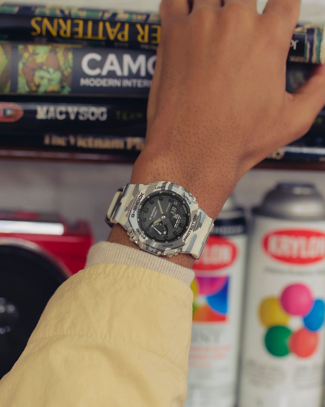 Fashion forward, camouflage cool — the ever-popular streamlined GA-2100 takes on