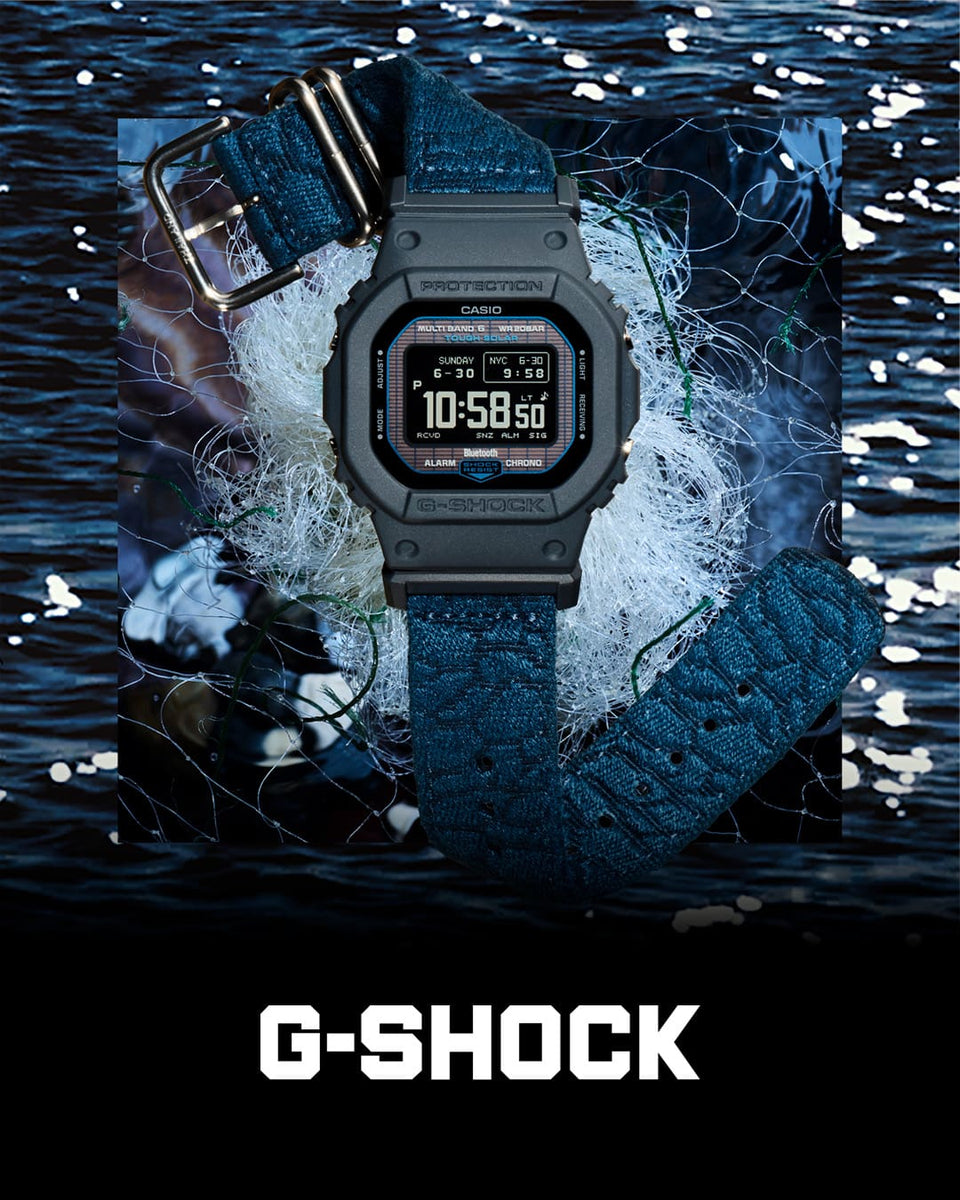 This limited-edition G-SHOCK features sustainable materials and functions to honor the vision of Earth Day, taking a stand on the need to protect the global environment. The cloth band is made with recycled material from discarded fishing nets, which are a significant factor in marine pollution, and the overall design evokes the surface of water. Featuring key resin components made with bio-based resin and Tough Solar capabilities to keep the watch powered by sunlight and other light sources, this environment-inspired watch embodies harmony with nature.