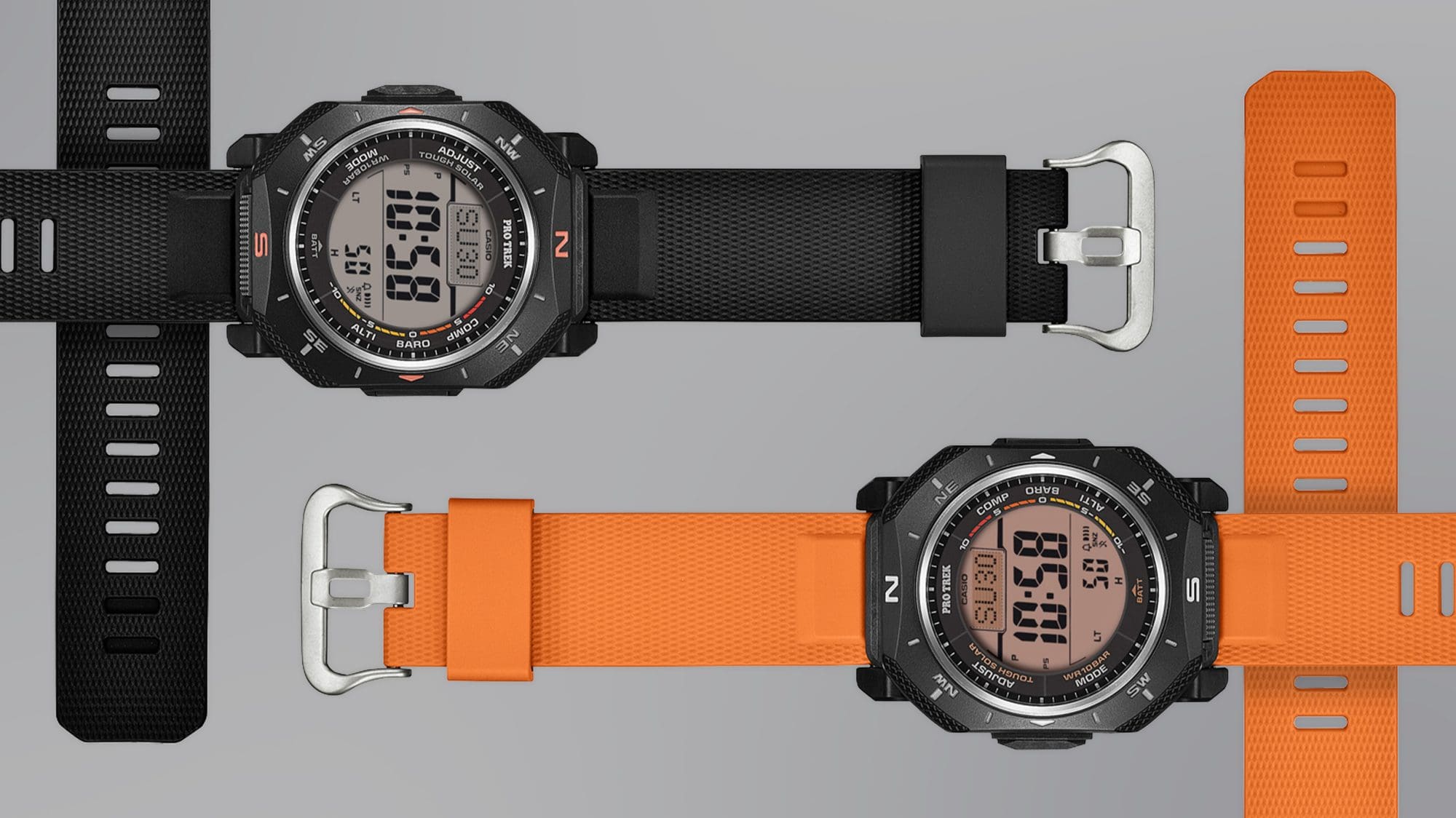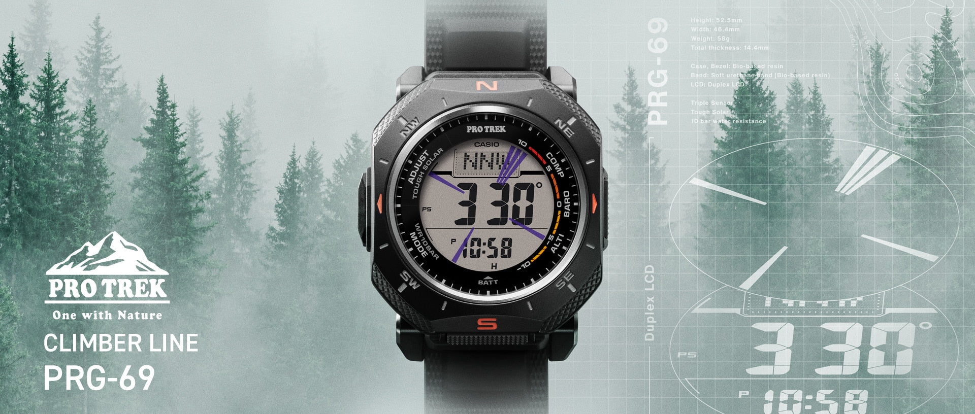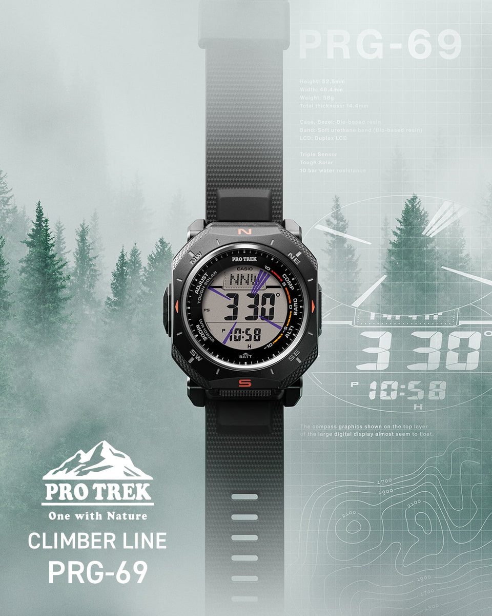 Introducing the first digital PRO TREK with an angular case design. Its sharp, compact profile pairs with a digital face featuring Duplex LCD for enhanced compass readability — functional beauty that brings together design and practical utility in authentic outdoor gear. Triple Sensor and Tough Solar provide reliable support in outdoor settings, while environmentally responsible materials reflect a thoughtful approach to construction. From design to function to materials, this outdoor timepiece embodies the brand concept of connecting with nature and enjoying the outdoors.
