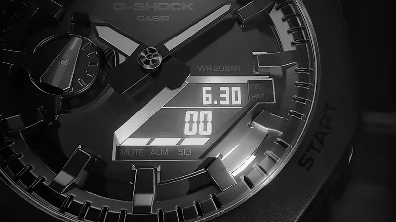 Crafted with a three-dimensional molding technique, the dial exhibits depth with a minute-mark-notched dial ring, three-dimensional index cuts, a mode dial, and an irregularly shaped LCD thoughtfully arranged in a harmonious balance. The generous layout contributes to a face design that combines simplicity with outstanding visibility.