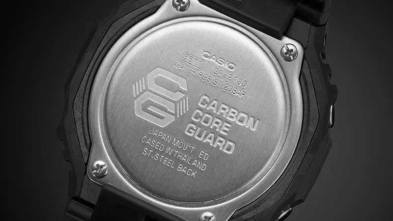 Inspired by the iconic DW-5000, the octagonal bezel, coupled with the minimalist design inherited from the AW-500, sets the GA-2100 apart. It upholds a commitment to a slim and compact form, preserving the strength of its predecessors through the Carbon Core Guard structure and an enhanced module design.