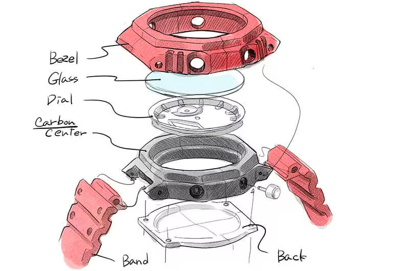 Incorporating the latest in toughness-driven construction, the use of carbon fiber-reinforced resin allowed for an unparalleled slimming of the case to its utmost limit. The side profile design pays homage to the inaugural model, featuring reminiscent button layout, uneven surface form, and a fixed-angle band.
