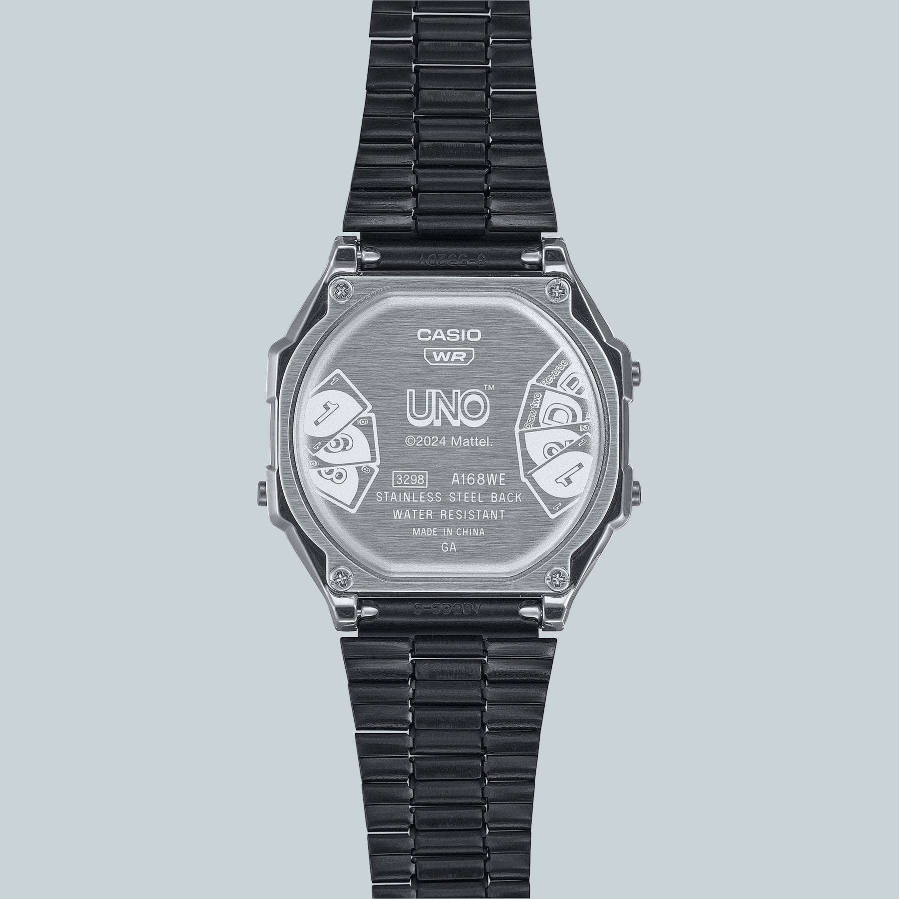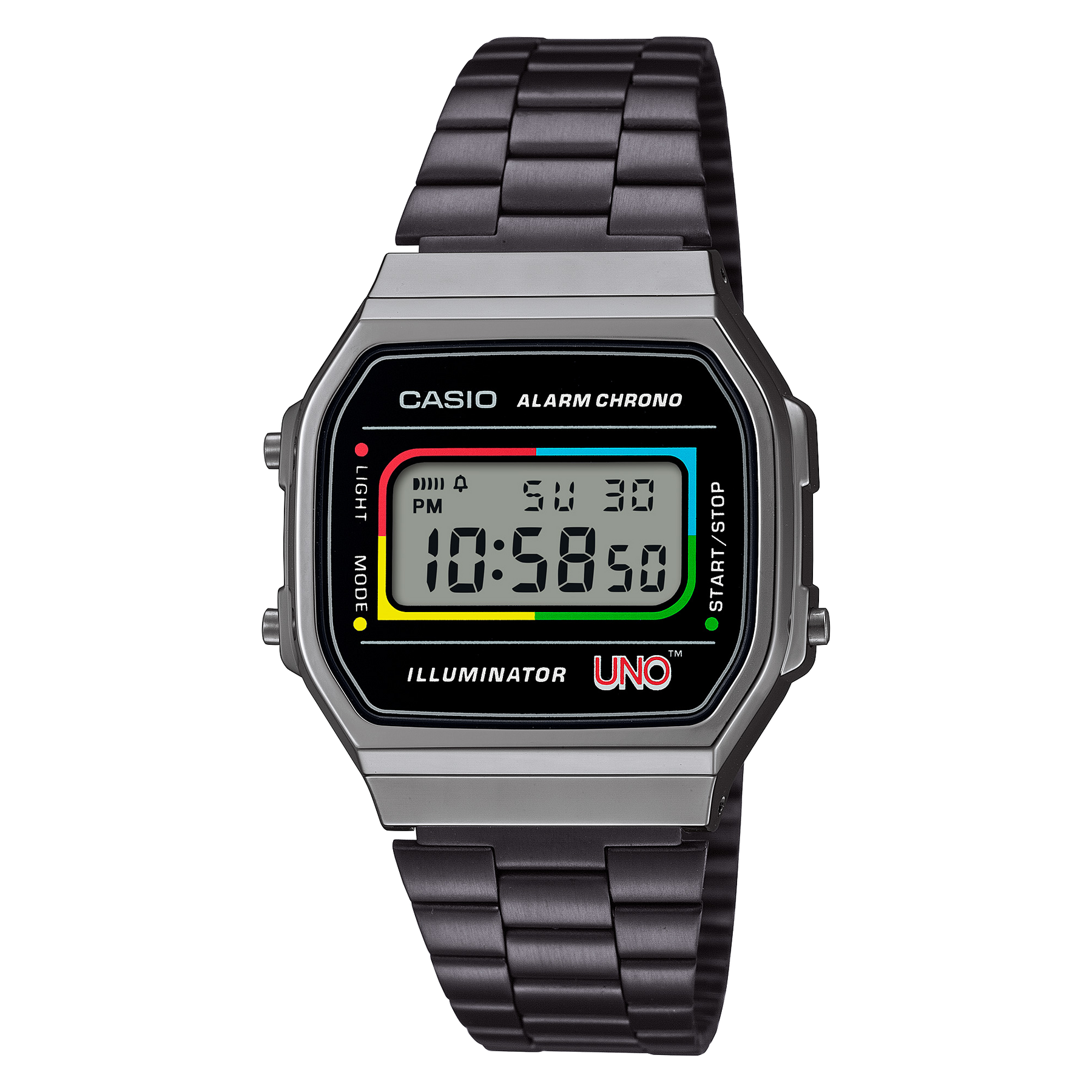 Introducing a one-of-a-kind design that brings together the nostalgia of CASIO and the classic card game sensation you know and love, Mattel’s UNO™! This singular collaboration begins with the popular vintage style of the A168 watch and features an UNO™ motif that honours the game’s classic 1979 design. The dial is adorned with the colours of the almighty Wild card — giving the player the choice of red, blue, yellow, or green. Activate the EL backlight and see the word “Wild” appear on the LCD.