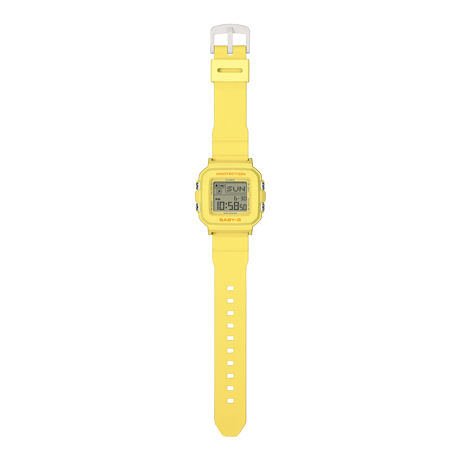 A heart appears on the LCD when the LED backlight is illuminated. In Time Mode, pressing the light button displays a random pixel-art animation. The clear digital display keeps the time easy to read while offering a touch of BABY-G fun.