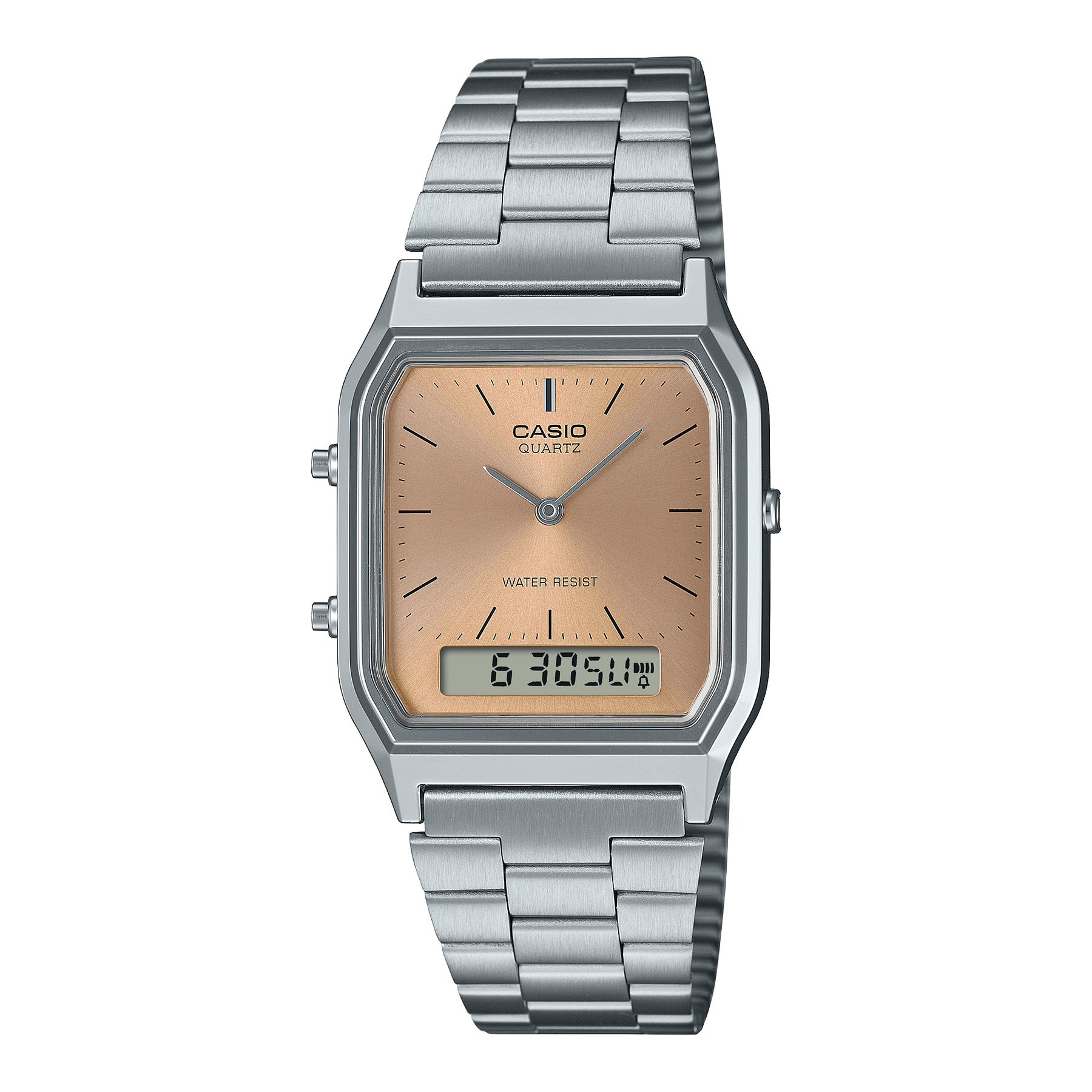 The AQ-230 brings together analog hour and minute hands with a digital display, achieving a balanced, harmonious look. The simple, streamlined design makes it easy to pair with any style, on or off the clock. A longtime favourite, this timepiece continues to be a favourite for its clean, fuss-free aesthetic.