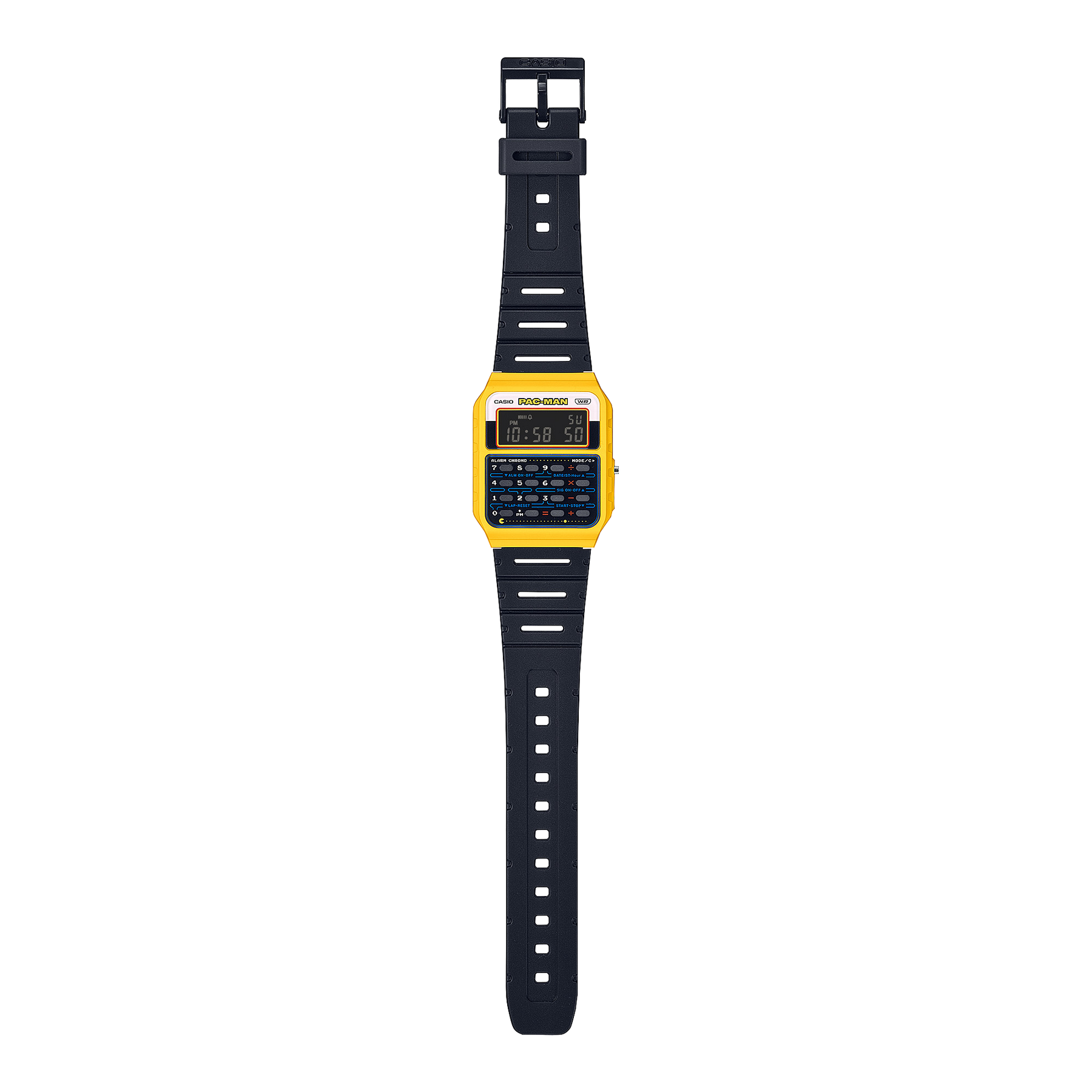 Presenting a whole collection of special collaborations to celebrate 50 years of CASIO watches and get you ready for 45th PAC-MAN anniversary in 2025. With playful designs and a nostalgic touch, this lineup brings to life the world of PAC-MAN, the ever-popular game from Namco Bandai Entertainment. The watch face is designed to evoke a game stage with the familiar characters running through the maze on the game screen, and is outlined by a yellow bezel to project the look of an arcade game machine. The case back is engraved with the characters and PAC-MAN logo. The band is made with bio-based resin, a material expected to help reduce environmental impact. Comes in special packaging with an arcade game machine design.
