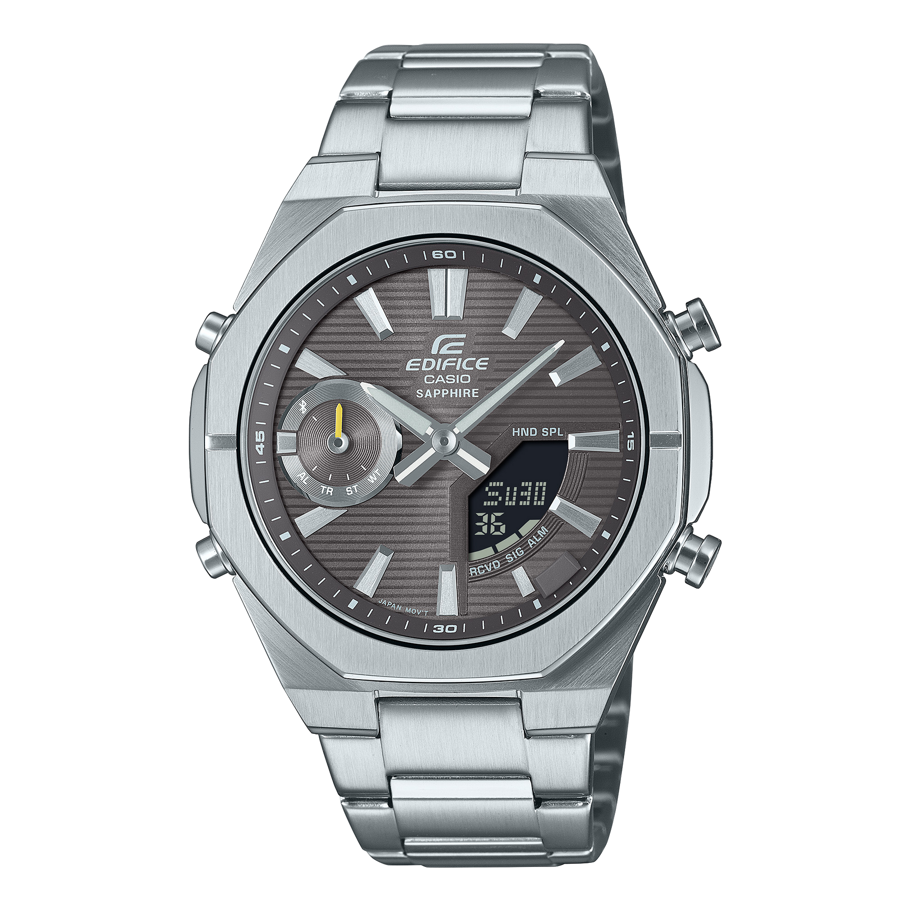 The watch hands and LCD are arranged for functional ease in a stylish, minimalist design. Engraved horizontal lines give the dial a sharp look. The yellow indicator hand adds a touch of accent color.