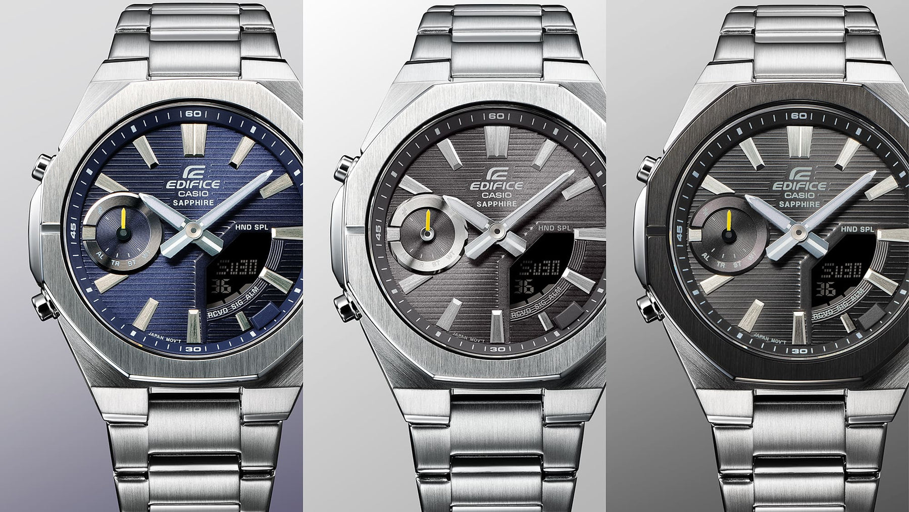 With these timepieces, we deliver both Smartphone Link connectivity and a slimmed-down, 9.6-mm case that will not get caught in your shirt cuff. The remarkably flat, slim, octagonal bezel exudes a sporty look that easily coordinates with both casual and business styles.