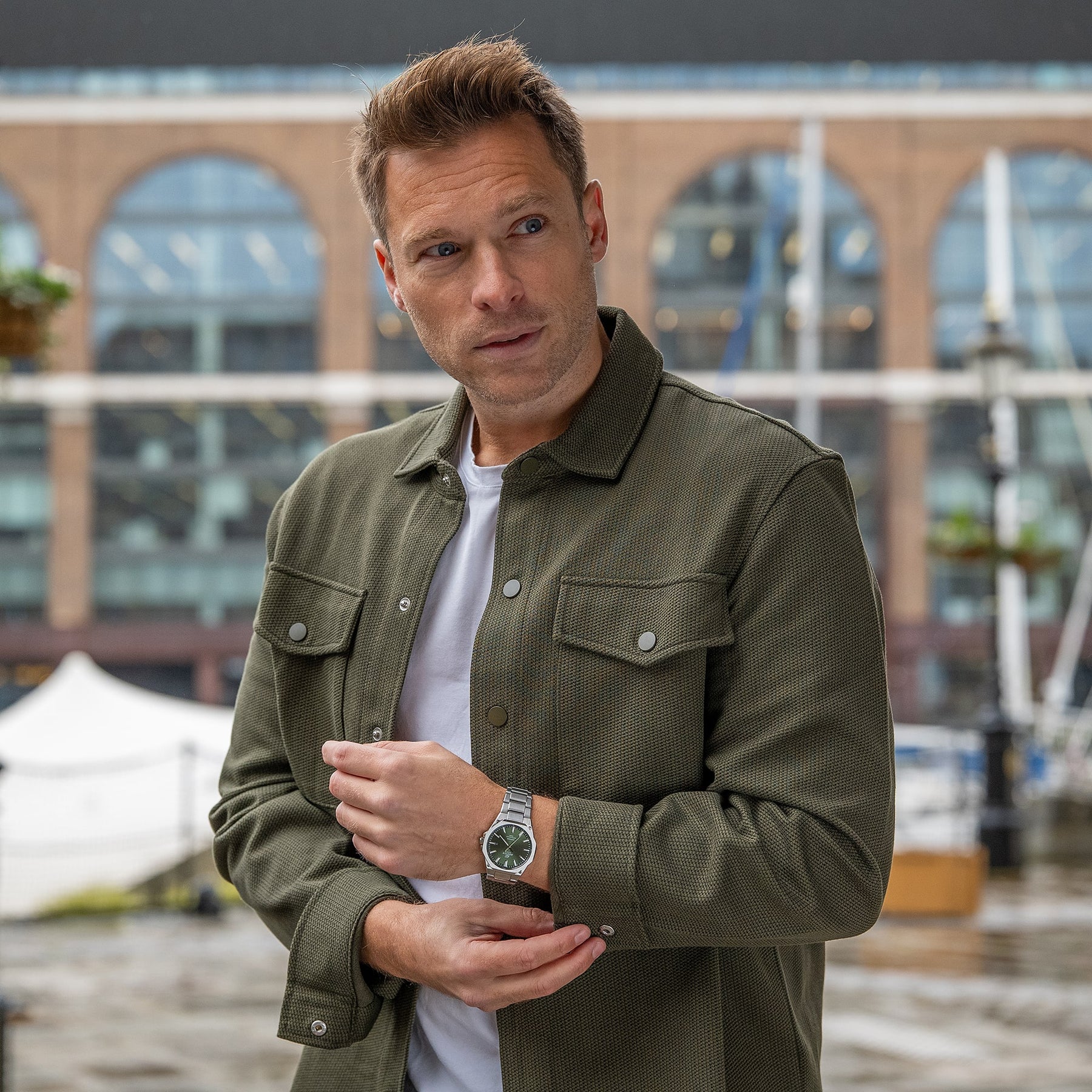 This three-hand analogue model features a slim 7.8 mm thick case that enhances fit.