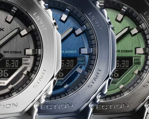 Forged in stainless steel with rounded hairline finish, the strong bezel says super style all the way. The dial is treated with vapour deposition finish for a meticulously detailed metallic look that suits a classic metal G-SHOCK timepiece. Incremental variations in the detailed square dot texturing on the wristband take casual urethane materials up a notch.