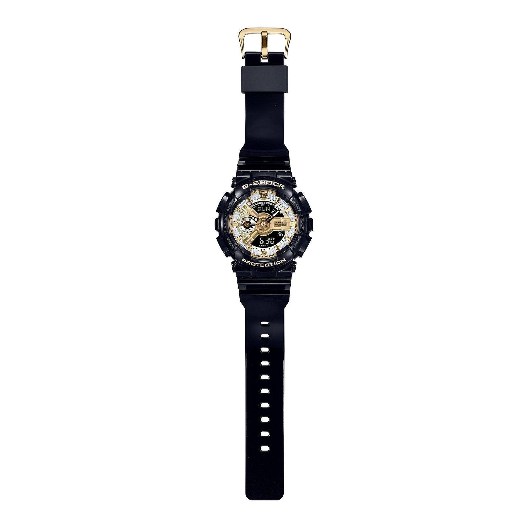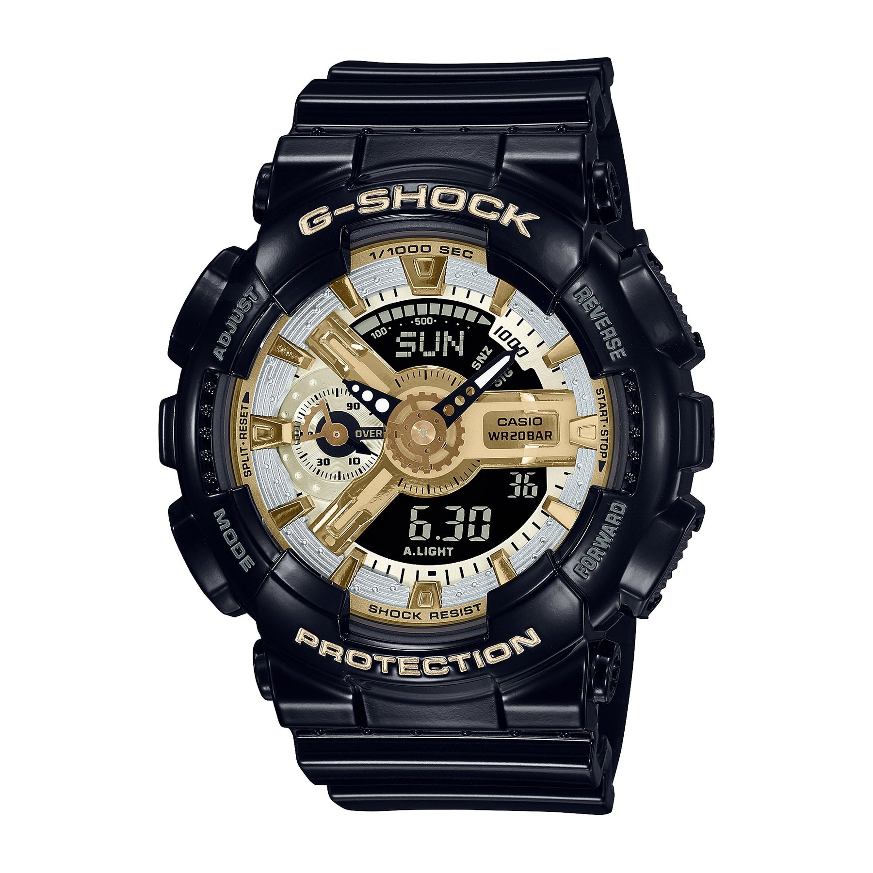 Enjoy the iconic oversized GA-110 with a watch face designed for depth and dimension and numerous fine components, all in a timepiece with a smaller profile. A two-tone colour scheme of shining gold and stylish silver accents the classic black G-SHOCK body. In a more compact design for the perfect casual fashion accessory for younger G-SHOCK fans.