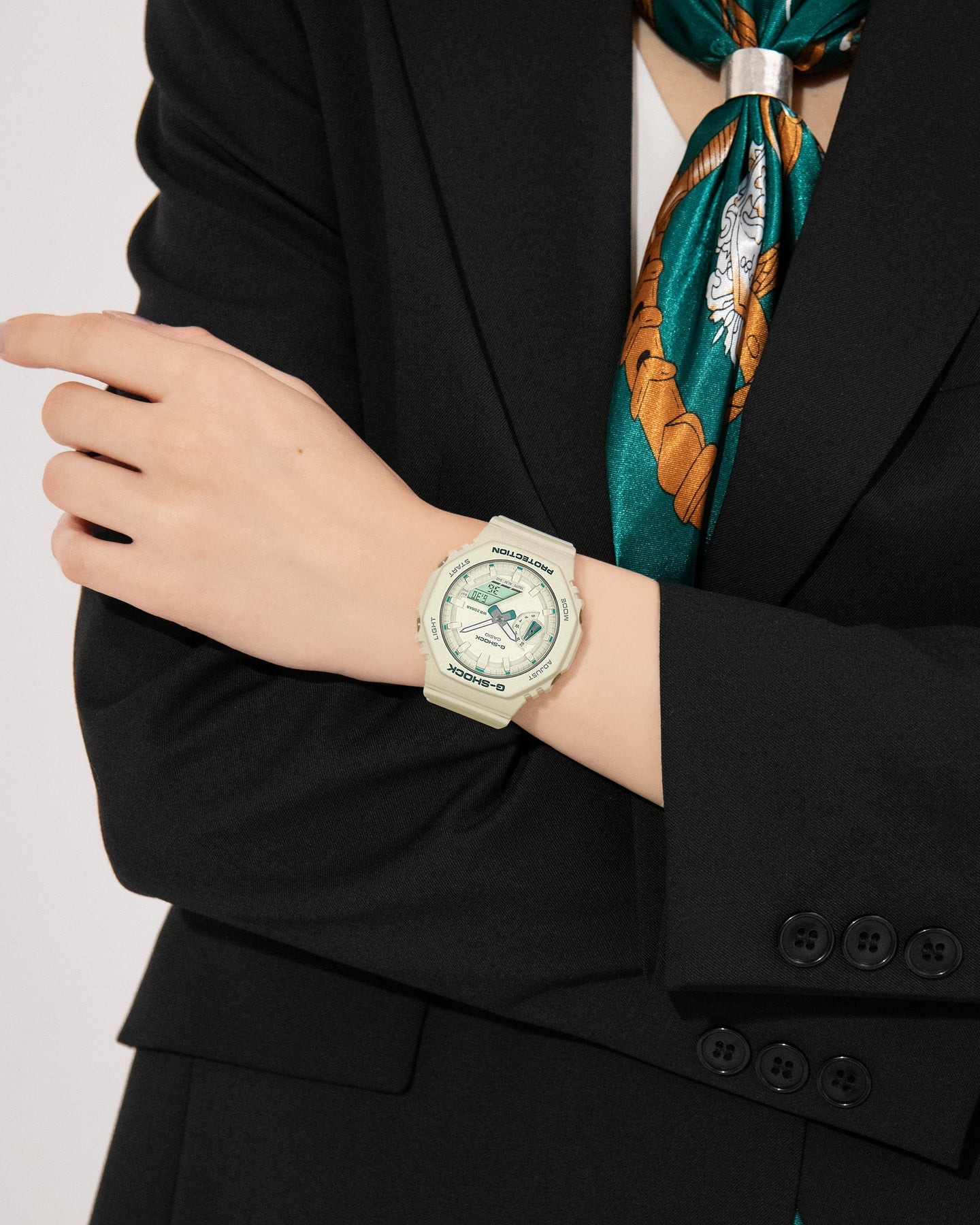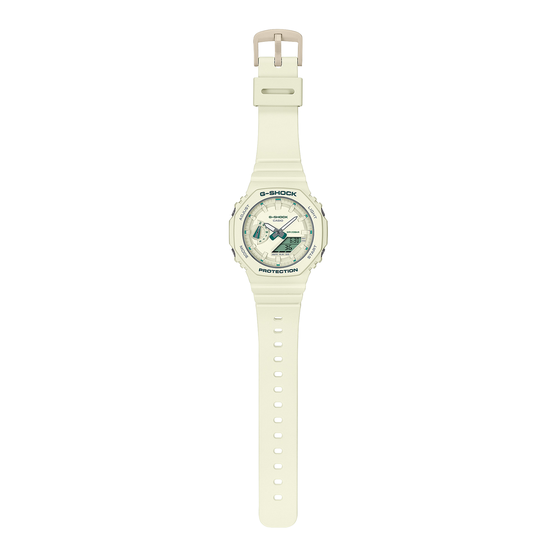 Go stylish and comfortable with the slimmer, more compact analogue-digital GMA-S2100 featuring modern green accents. The flat face and simple bar index marks come together in a streamlined, satisfying design. An original spin in on-trend green for details like the logo, index mark, and LCD makes this watch a perfect street fashion accessory.