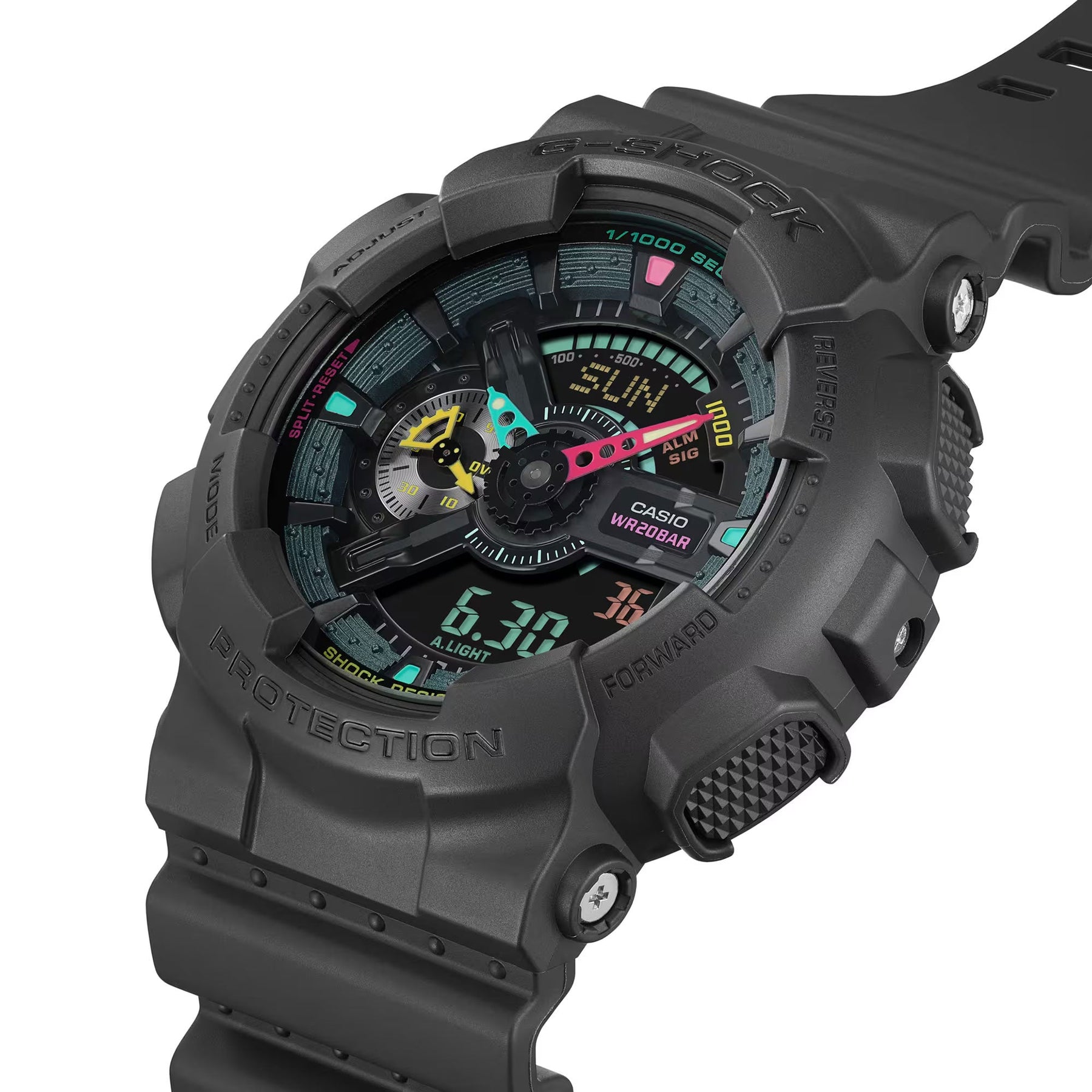 Bold black meets vibrant colour in these tough G-SHOCK watches with fluorescent accents. The matte black bezel and band contrast stylishly with touches of vivid blue, pink, and yellow on the hands, hour markers, and dial marks, transporting you to a virtual world. Playful and bold, these designs will crush in any fashion scene. Choose your favourite of five timepieces — the GA-100, GA-110, or GA-700 with large case; the GA-B2100 with octagonal bezel plus Bluetooth and solar charging; or the GX-56 digital watch with large case. Cool matte black and fluorescent colours come together in a stand-out pairing. Which one do you want?