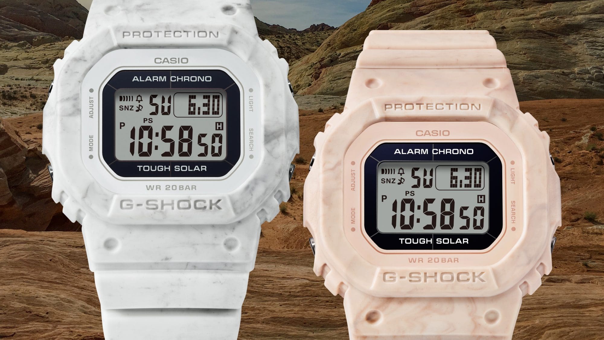 Recharge body and mind with a retreat to the great outdoors. Introducing a G-SHOCK inspired by journeys that bring you back to yourself. Garal colour moulding combines resin in different colours to create marbled patterns on the bezel and band, creating a design that recalls the grandeur of rocks and stones in unspoiled lands.