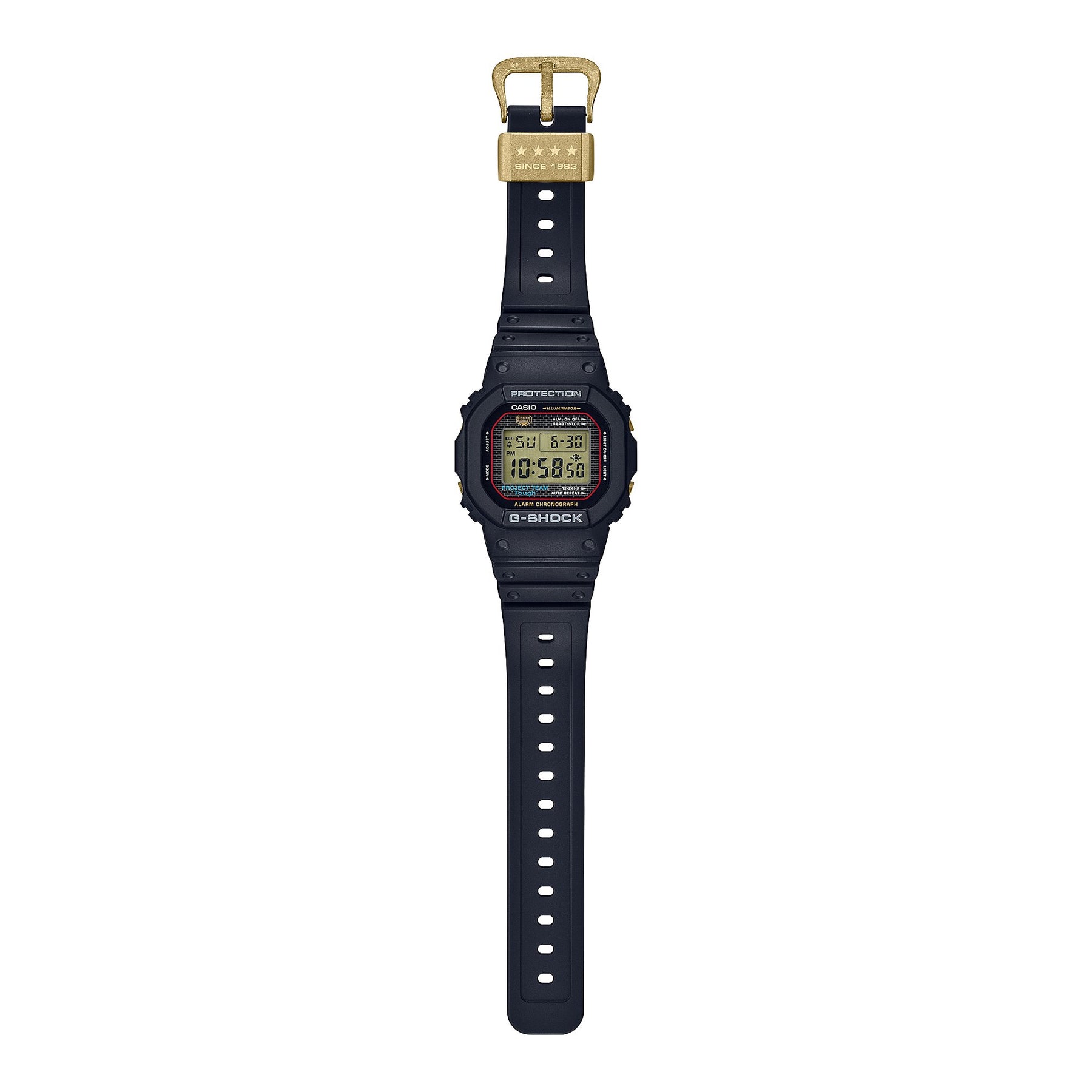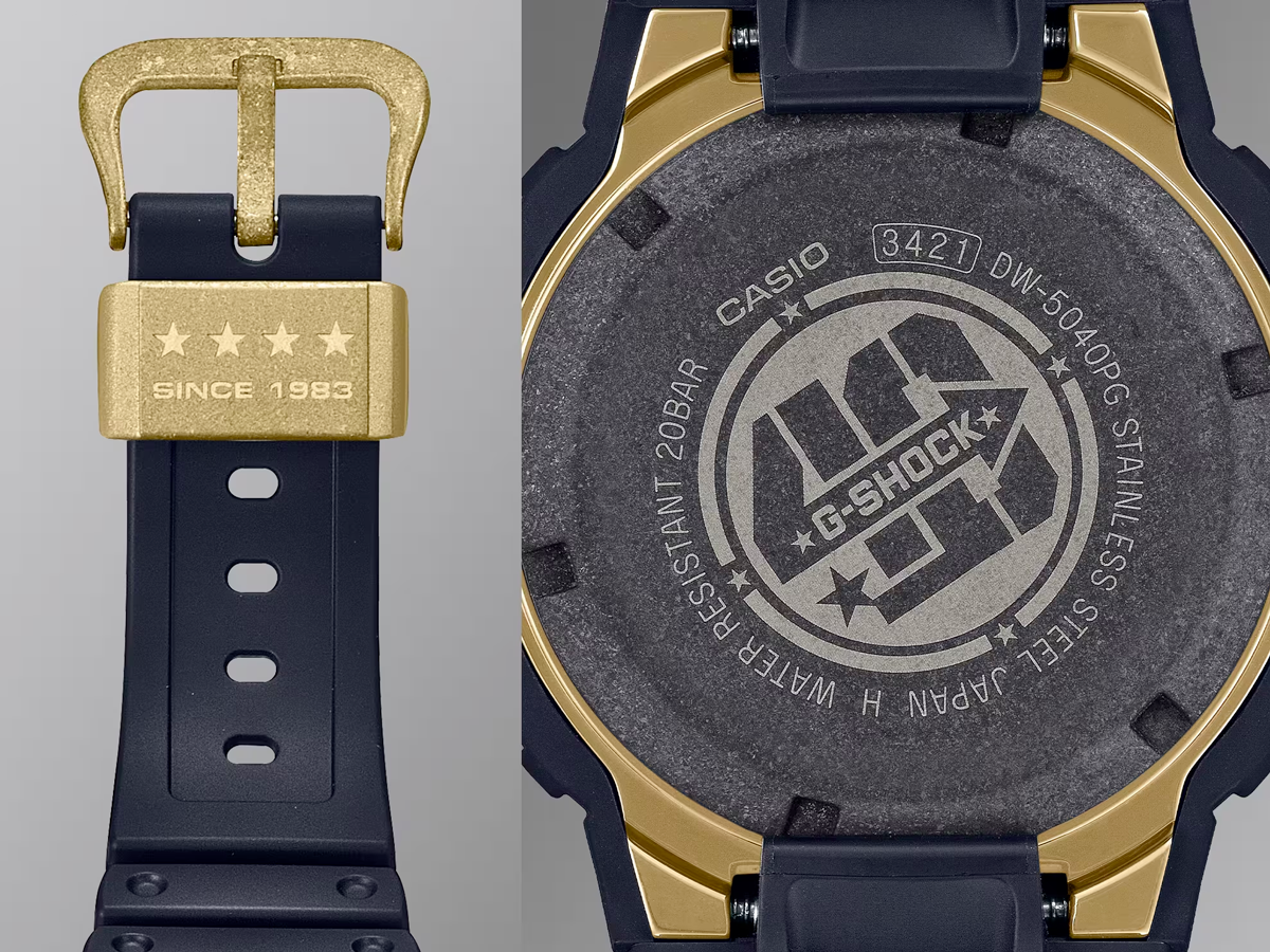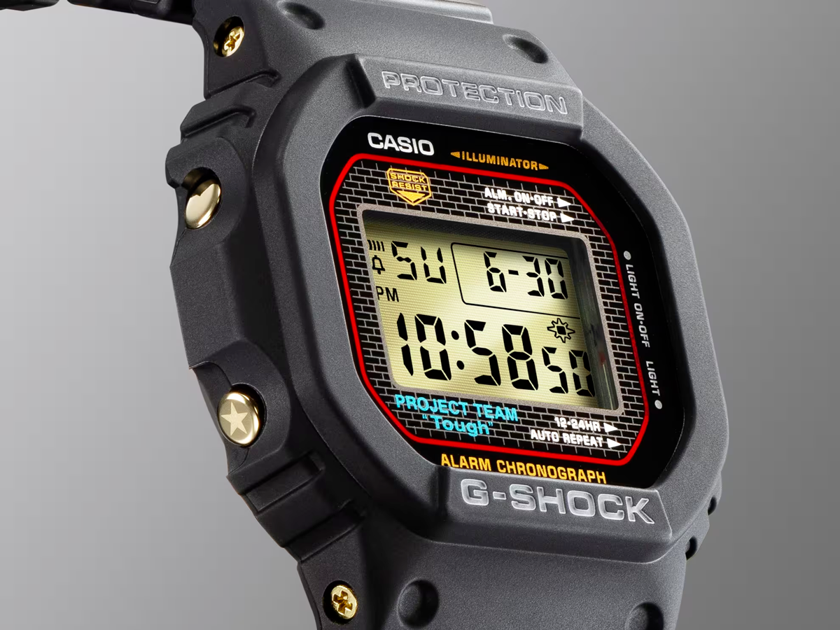 Paying homage to the very first G-SHOCK, the DW-5000C, this model features recrystallisation and deep-layer hardening processes applied to the screw-lock case back, buckle, and band loop. Black IP is then applied to the case back, and gold-coloured IP to the buckle and band loop. In addition, the bezel and band are made with bio-based resins to help reduce environmental impact. The words ‘PROJECT TEAM “Tough”’ adorn the dial.