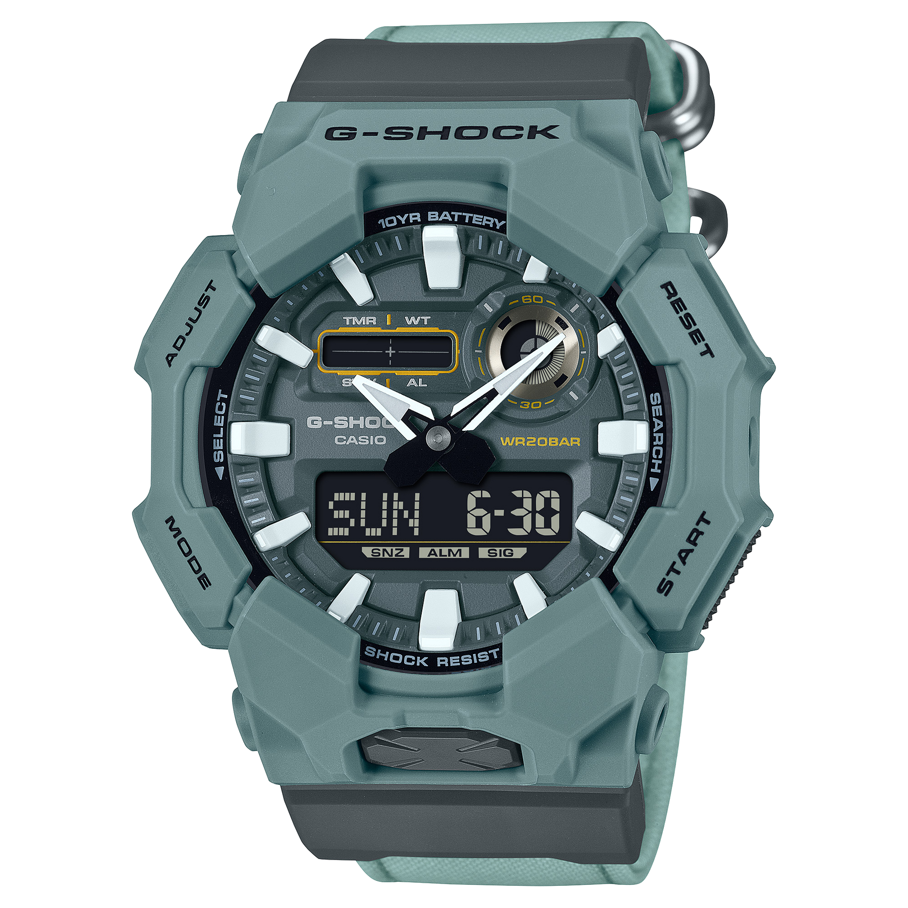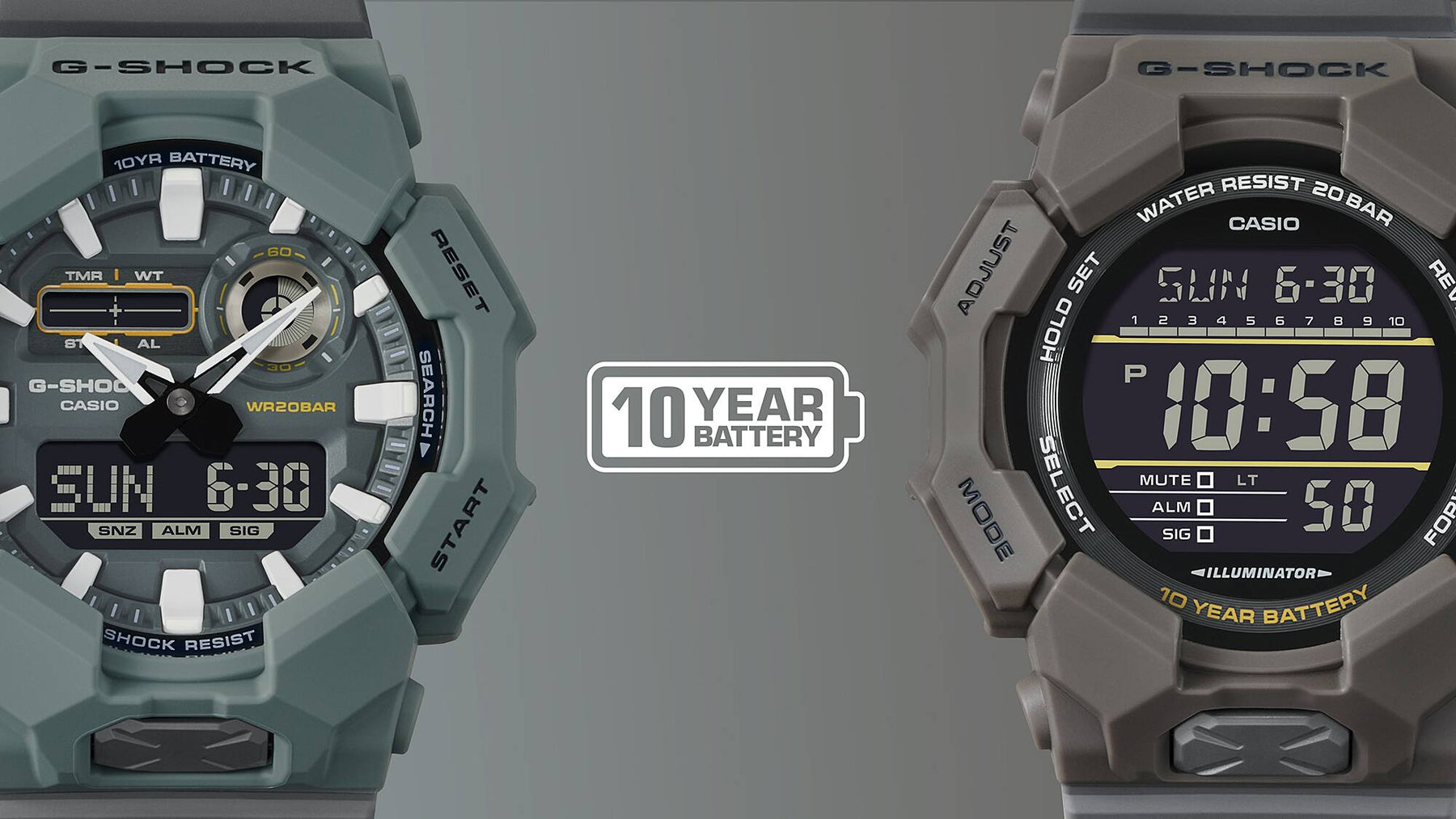 The GA-010 deliver the shock-resistance to withstand hard use and a battery that lasts for 10 years. Key resin components are made with bio-based resin, a material expected to help reduce environmental impact.