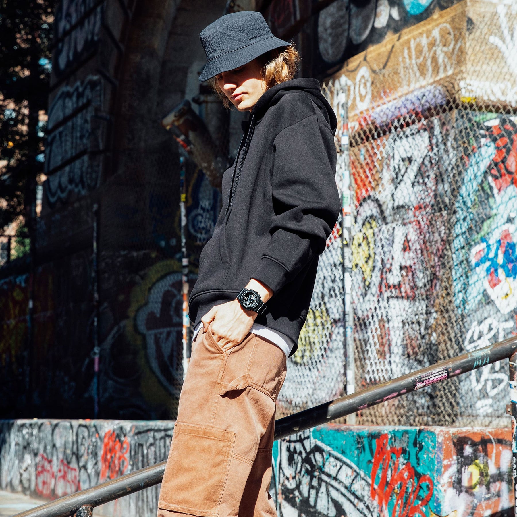 From G-SHOCK in its pursuit of toughness, this model from the GA-110 series features a big powerful face. Black is used as the main G-SHOCK-like colour to express more strength. Equipped with a millisecond stopwatch, a speedometer, and JIS class-1 magnetic resistance. Small three-dimensional cog-shaped parts are assembled on the dial, which fuses analog and digital displays and features shiny silver indices that make the design stand out more sharply. A practical and cool model based on the ever-evolving G-SHOCK.