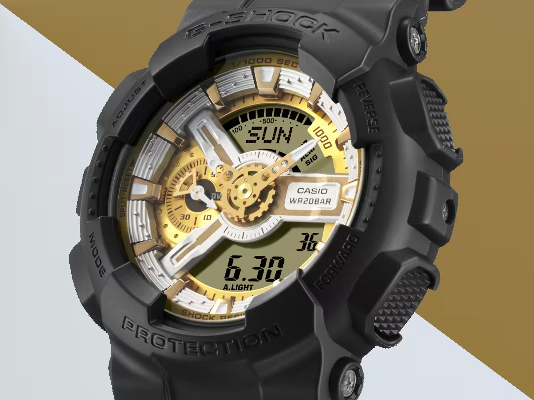 The GA-110 with its distinctive large case takes on classic black for the band and bezel, then goes bold with colour on the dial.