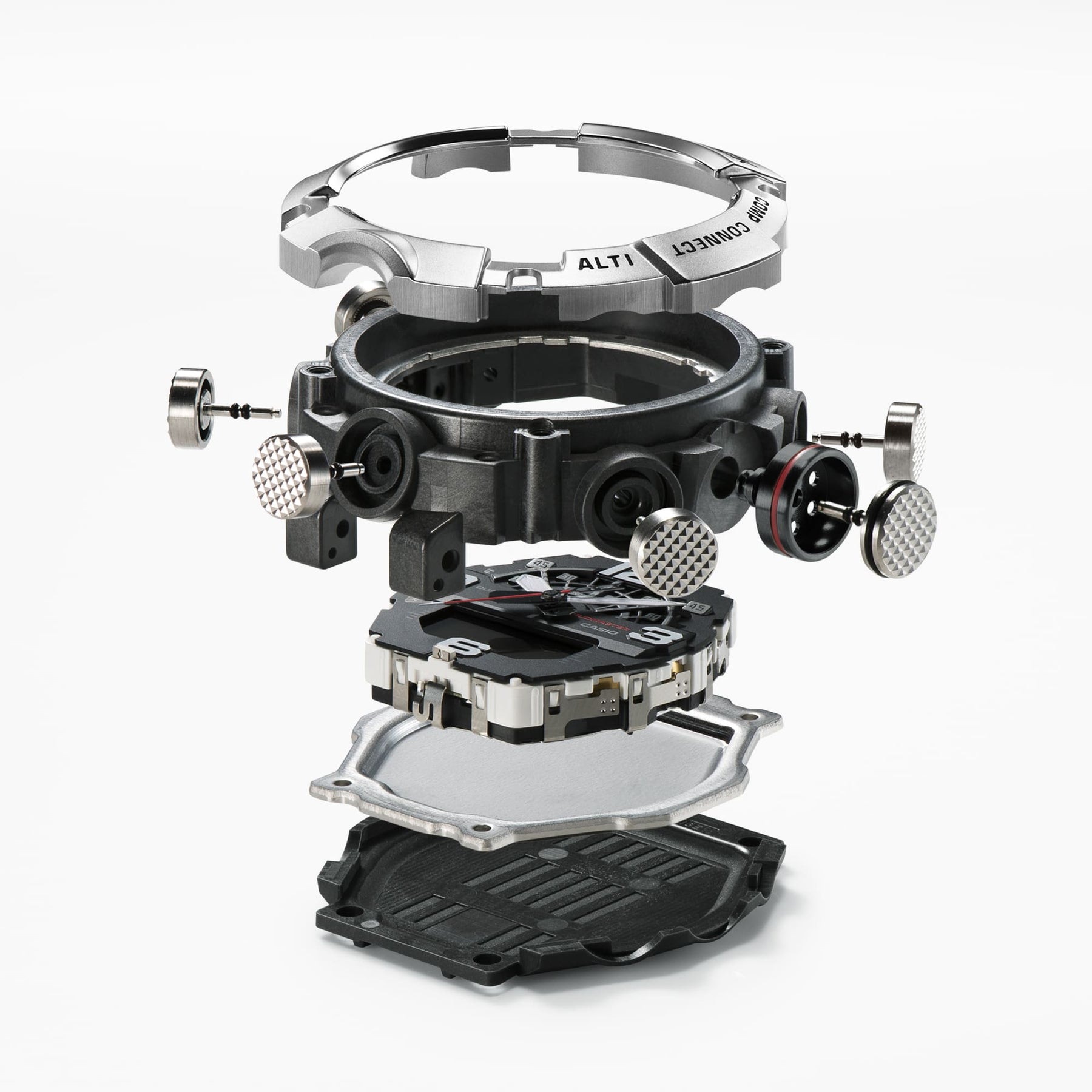 The GG-B100XM-1ADR features a silvery stainless-steel bezel with a honing finish, delivering outstanding scratch resistance that protects against mud and dust and a subtle matte texture that minimises reflected light. The stainless-steel GG-B100XMB-1ADR bezel is ion-plated in black with a mirror finish for both outstanding scratch resistance and a refined lustre.