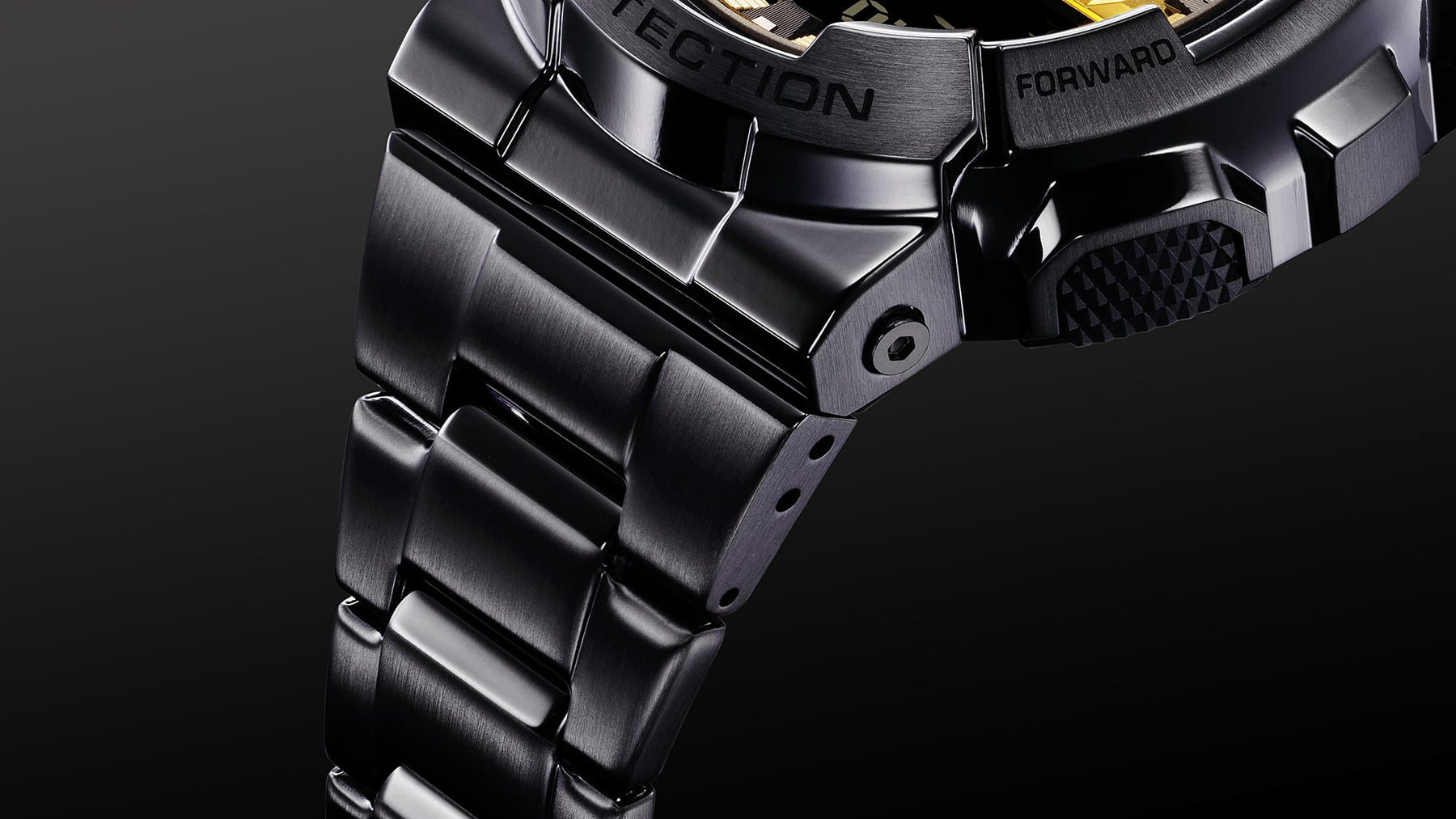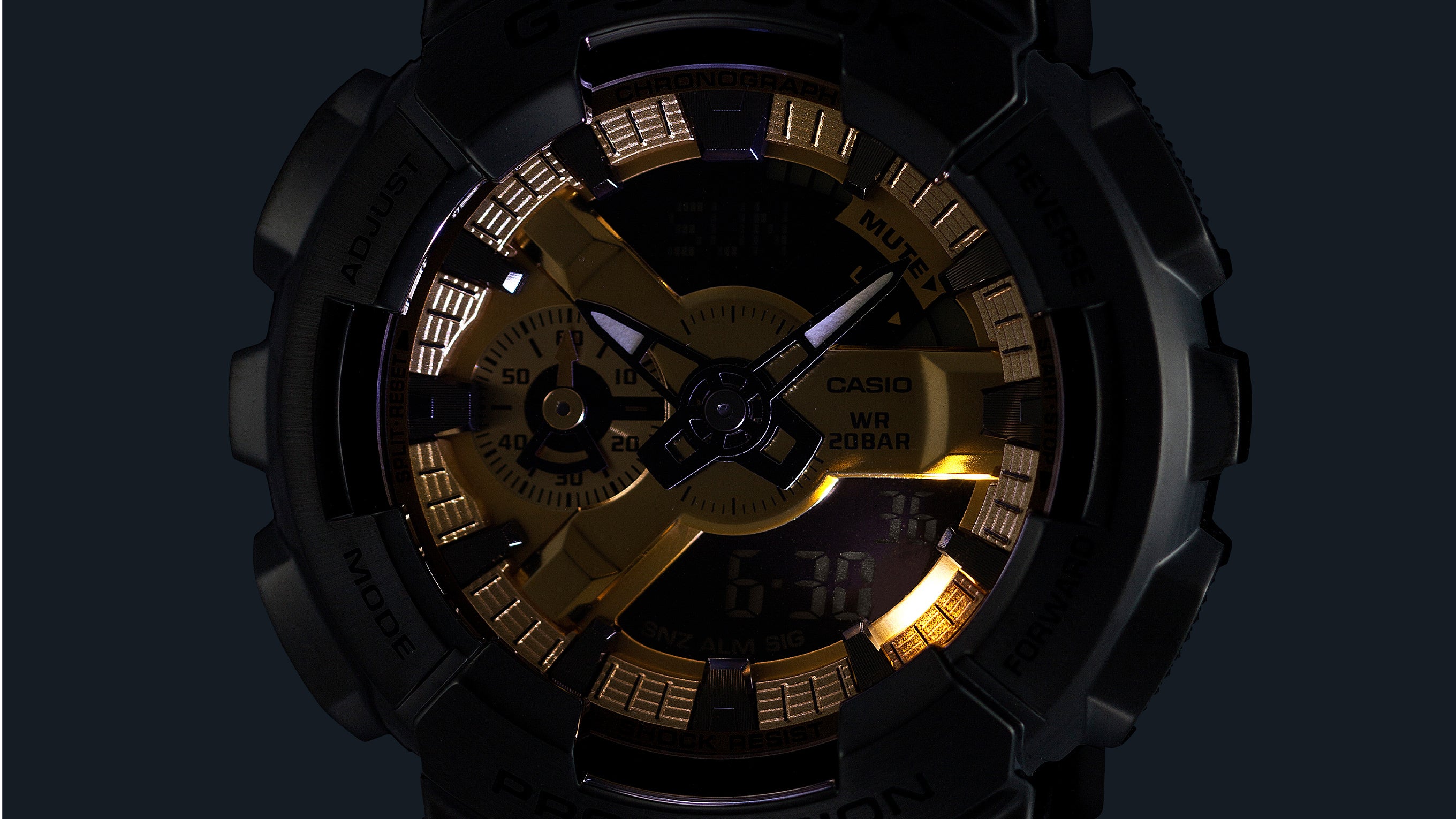 With a metal band, all-black ion plating, and dial in a gold colour, the GM-110BD-1A9 is up for anything — work or play.