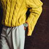 The metal band, together with a pop of fresh colour from the metallic brass dial, is up for anything — work or play.