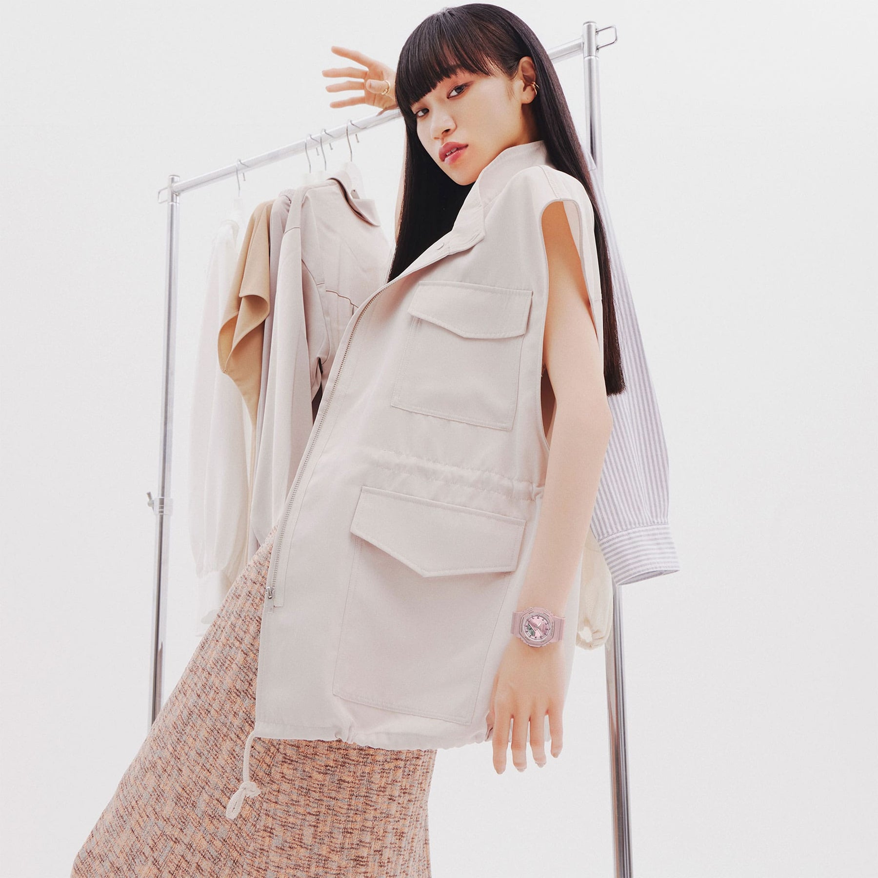 Pearlescent polarized coatings that change in appearance depending on the viewing angle are applied to the bezel and band, offering a gentle, elegant look as smooth as silk. A matte finish tempering the shine gives a natural taste to the design. A selection of three easy-to-coordinate color options are offered: pink, white, and beige.