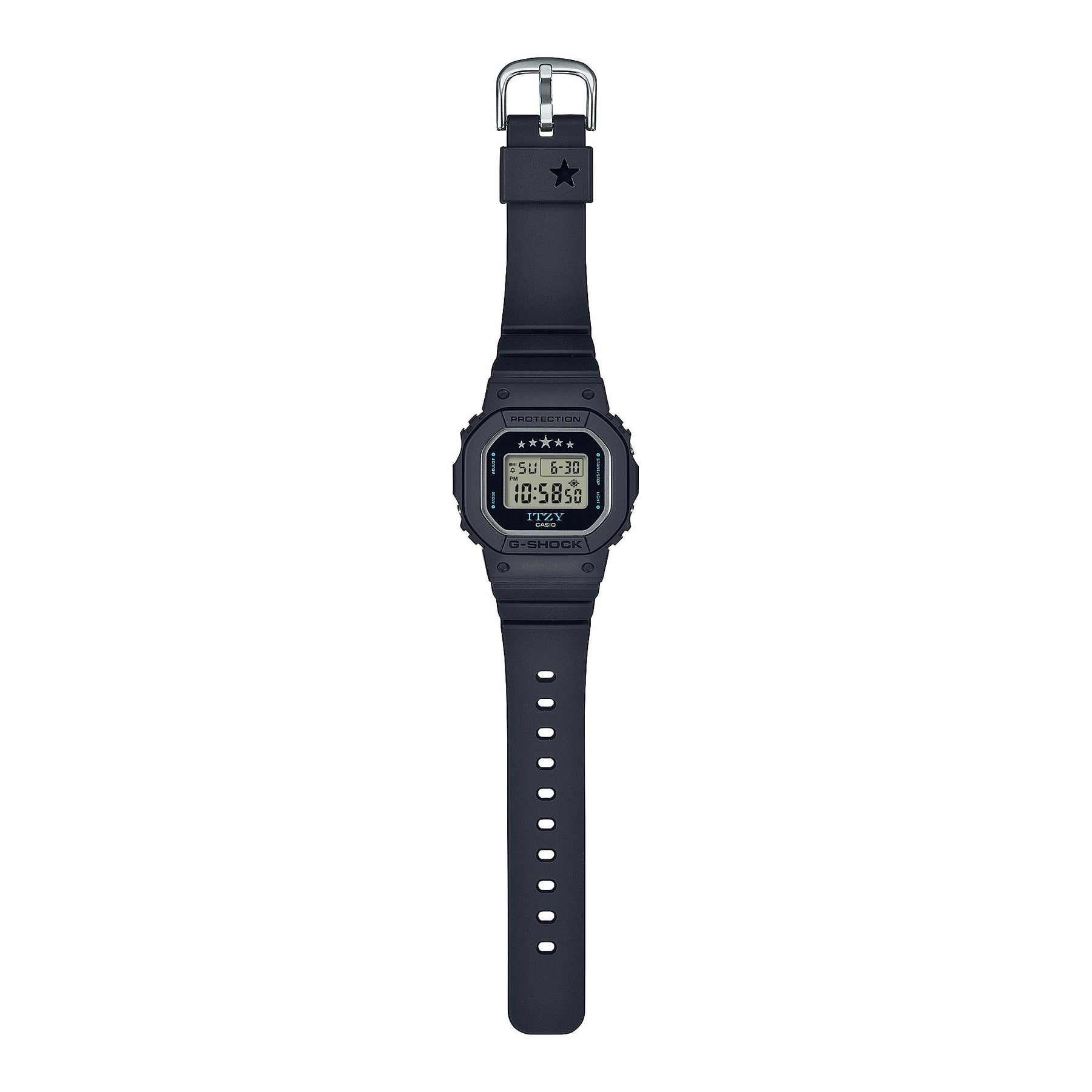 The special packaging features the ITZY and G-SHOCK logos, and the members' signatures on the outer box.