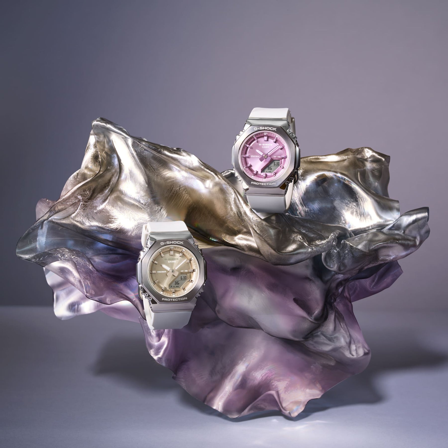 Along with making the bezel top slimmer than the previous GM-S2100 models, the new watch features a dial made with metal adding enhanced textural appeal. The dial features a simple, flat design, and the index marks and LCD are given neat, angular forms as well. Offered in a selection of trend-conscious hues that are easy to coordinate with any wardrobe.