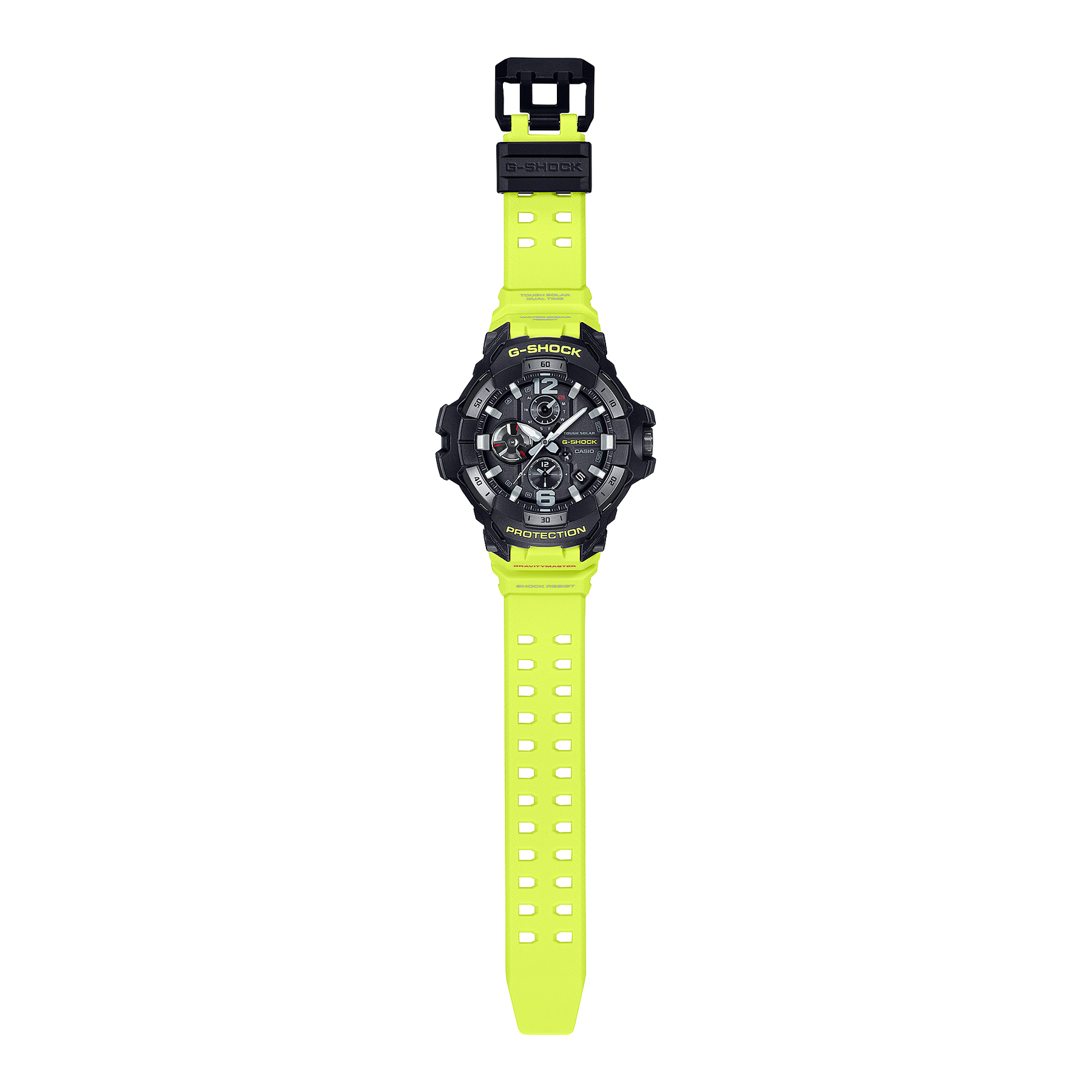 The organic form of the GRAVITYMASTER GR-B300RY is inspired by next-generation aircraft and rendered with a seamless exterior design. The Carbon Core Guard structure and wide 3D face deliver durability, readability, and a comfortable fit. Enjoy all the practical functions as well, including dual-time simultaneously showing the time in two cities, a flight log memory function for recording routes traveled, and more.